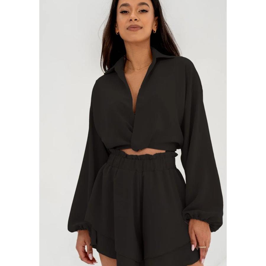 Černá dámská letní košile stylově krátkého střihu. Ukončeno límcem a pohodlnými elastickými pásky ve volných rukávech.