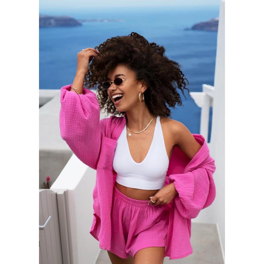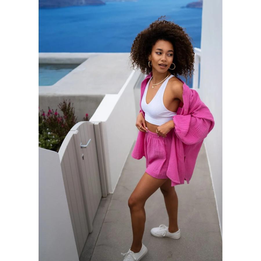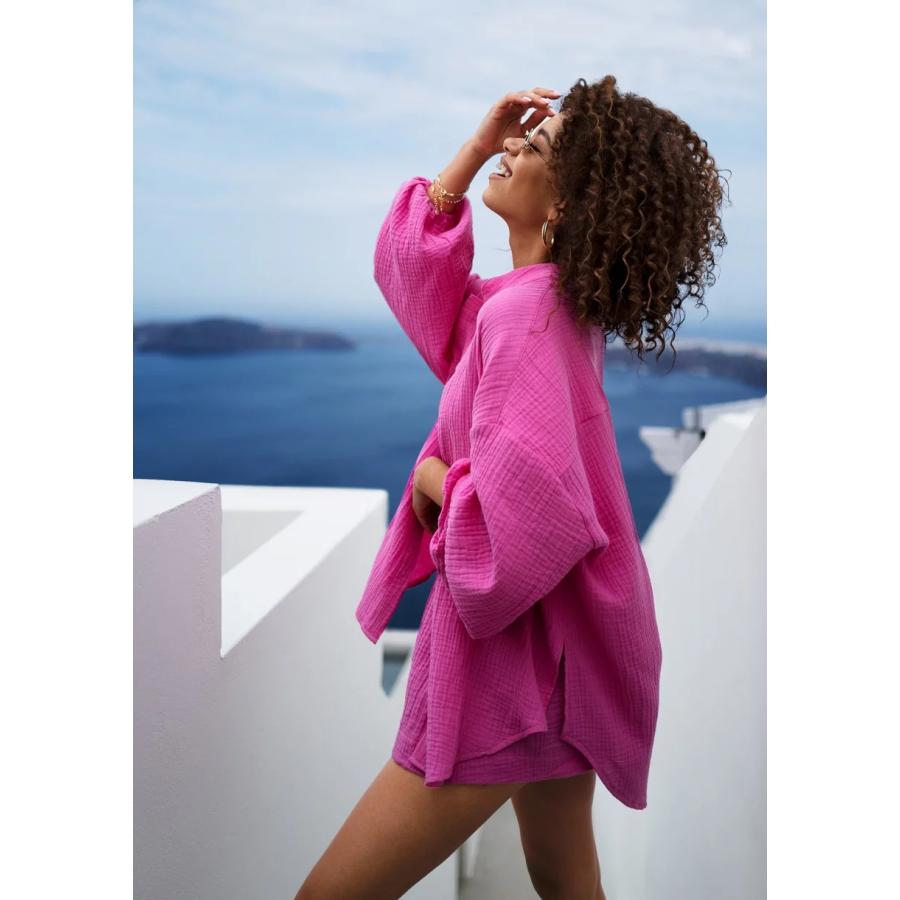 Růžová dámská košile ze vzdušného mušelínu. Stylový oversize model s pohodlnými gumičkami na rukávech.