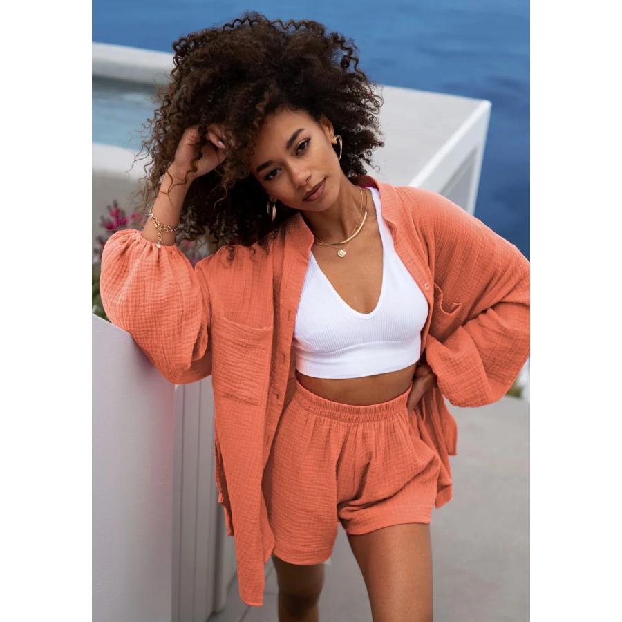 Meruňková dámská košile ze vzdušného mušelínu. Stylový oversize model s pohodlnými gumičkami na rukávech.
