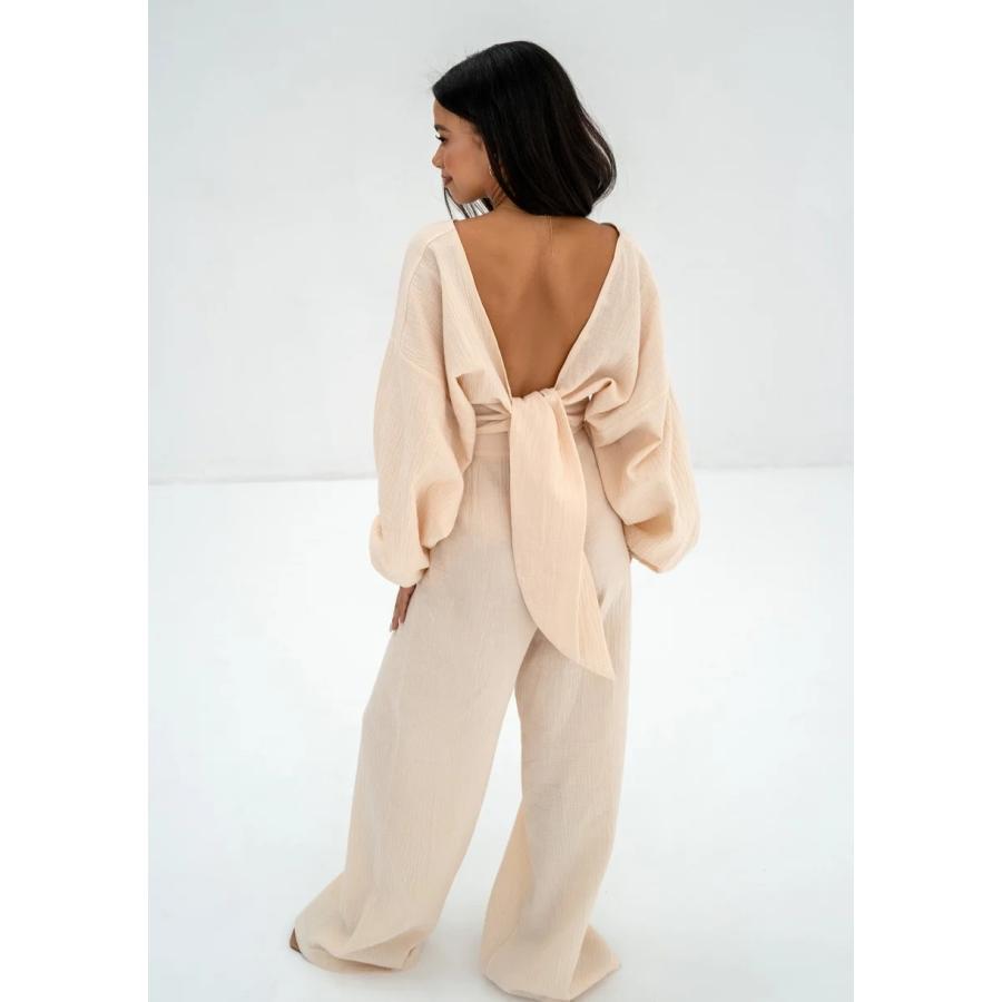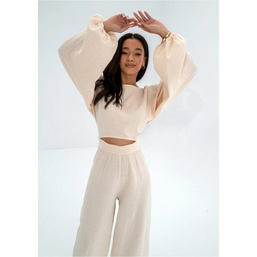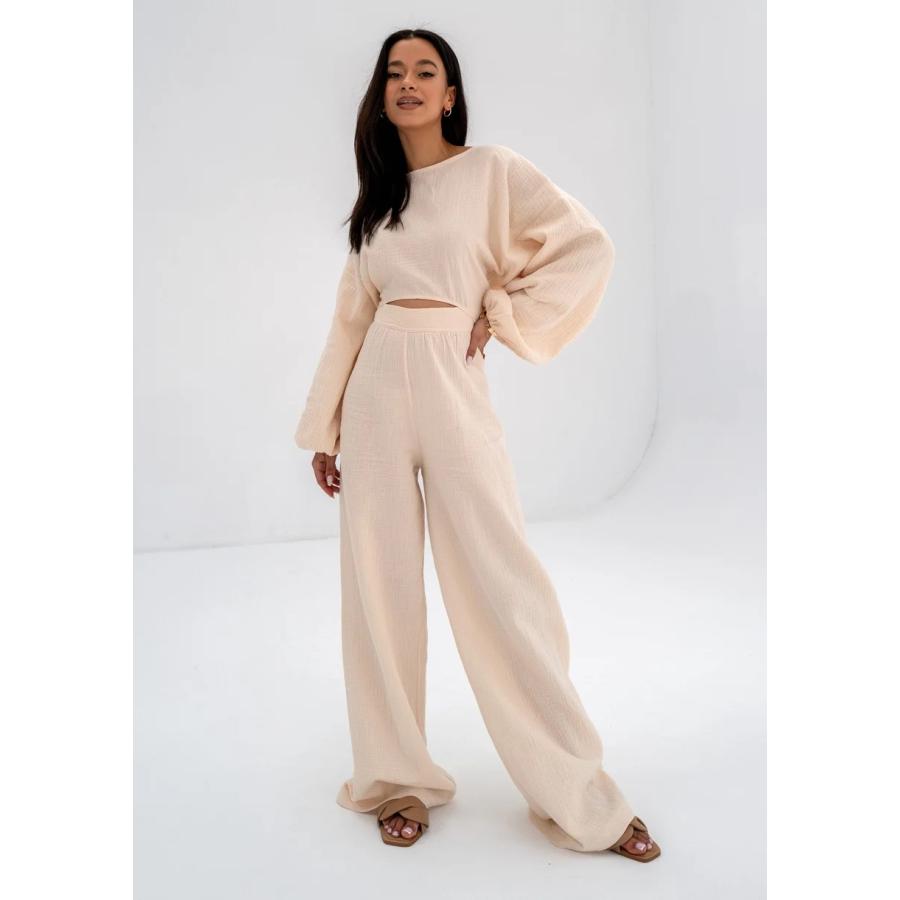 Letní dámské kalhoty krémové barvy, s módní širokou kalhotou a vysokým pasem. Vzdušný model z přírodního mušelínu.