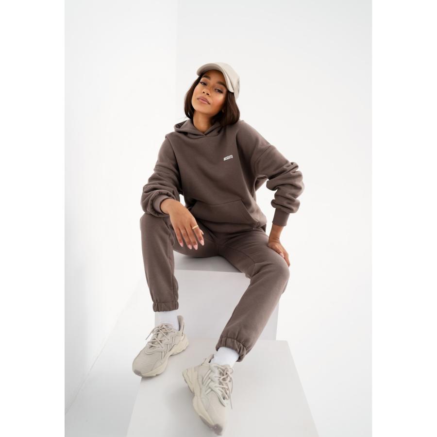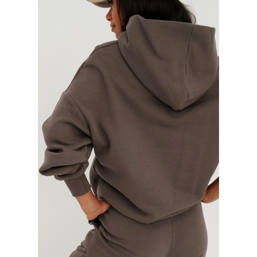 Hnedá dámská mikina stylového oversize střihu s kapucí a kapsou. Vyrobeno z bavlněné tkaniny s jemným vláskem na spodní straně.