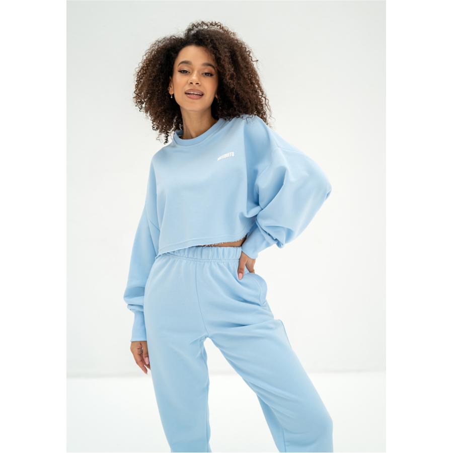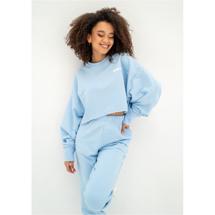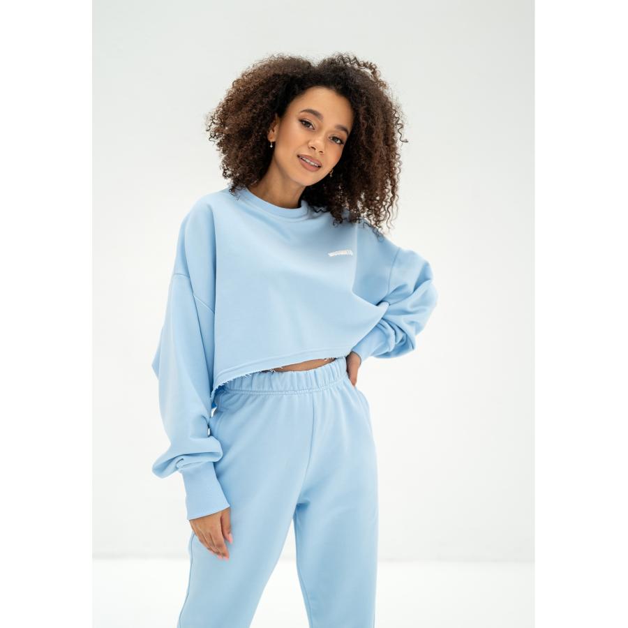 Stylová, lehká dámská crop mikina pro jaro a léto, vyrobená ze smyčkového úpletu v pastelové baby modré. Oversize provedení, zvýrazněné bílým logem.