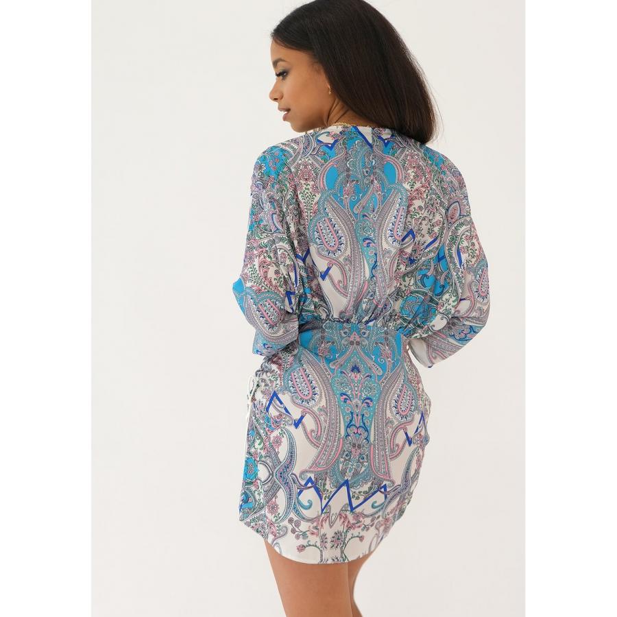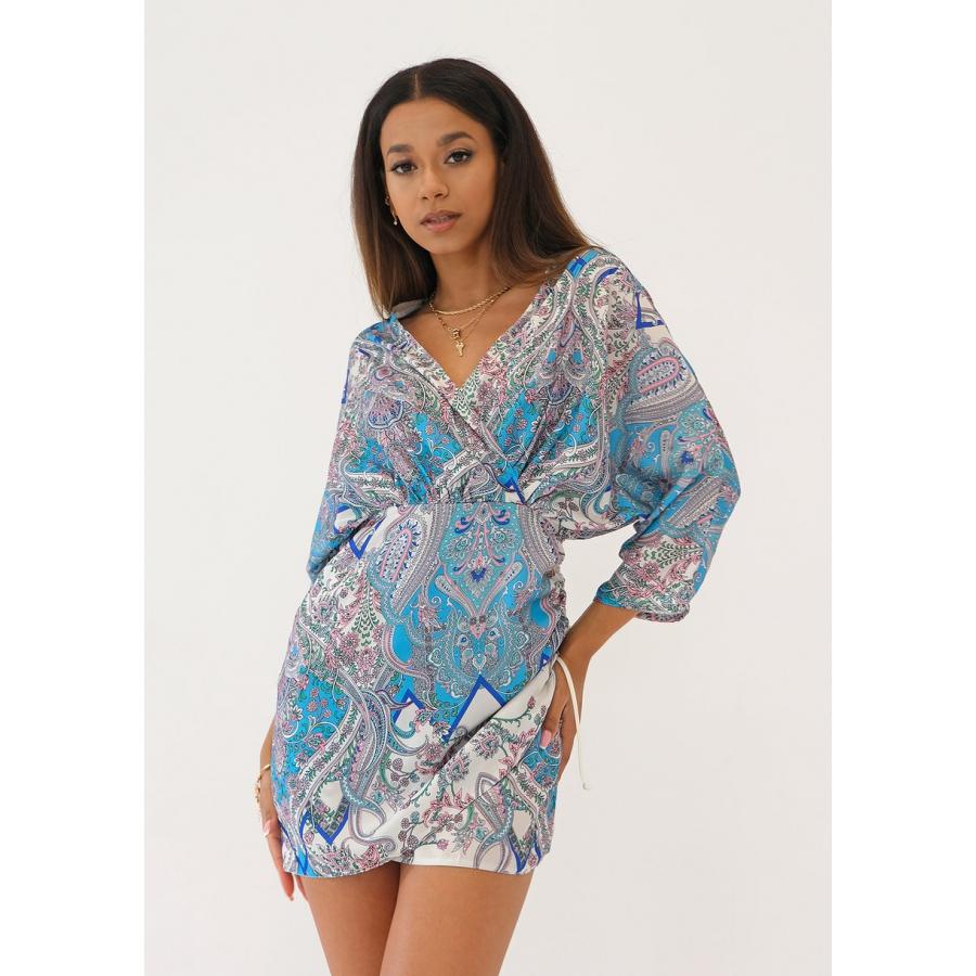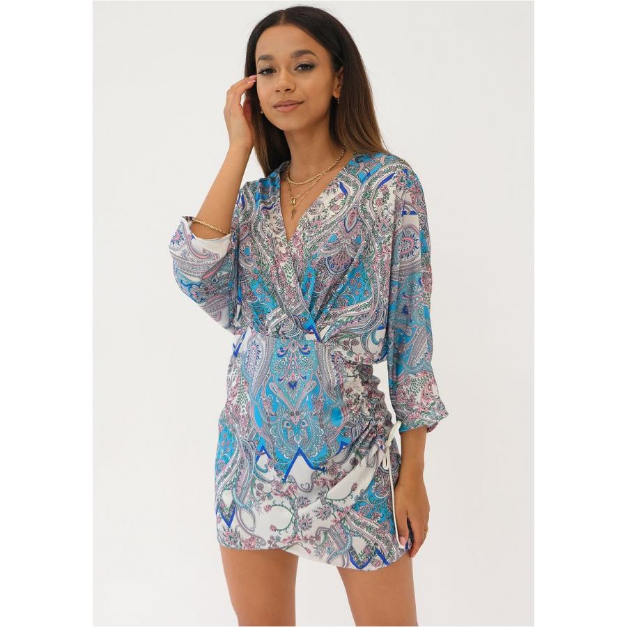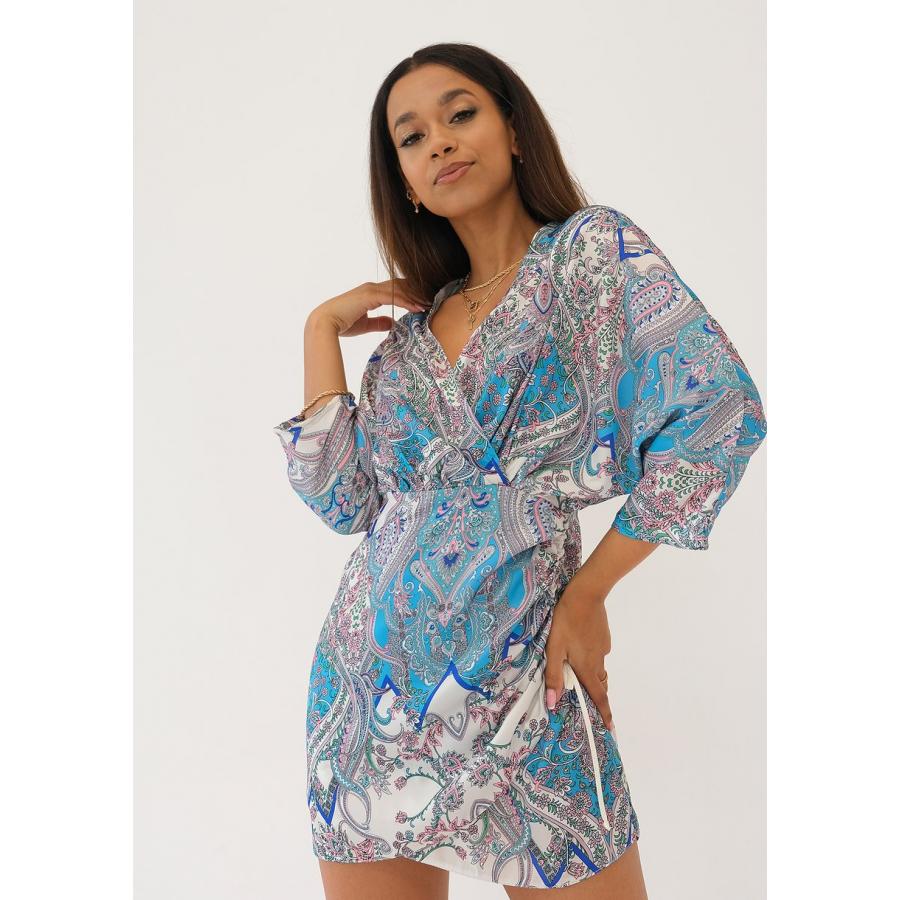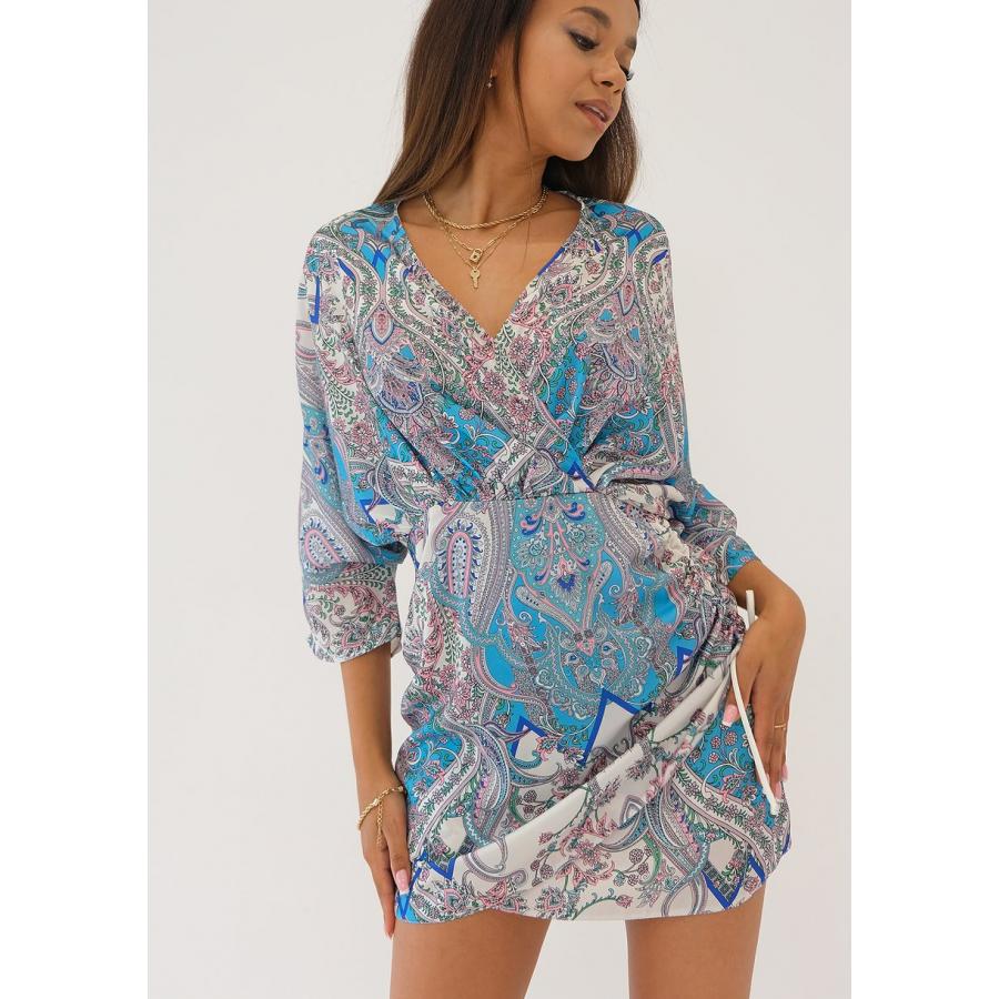 Decentní minišaty překvapí bohatým vzorem. Jedná se o koktejlovou kreaci s obálkovým výstřihem a 3/4 rukávy. Střih zvýrazňuje postavu a odhaluje nohy.