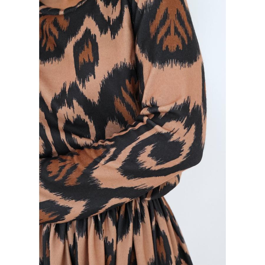 Hnědé minišaty s dlouhým rukávem a zvonovou sukní z příjemně měkké látky. Žádný jiný střih se mu nevyrovná z hlediska pohodlí a všestrannosti! Model zdobí výrazný potisk, dokonale ladící s podzimními a zimními trendy.