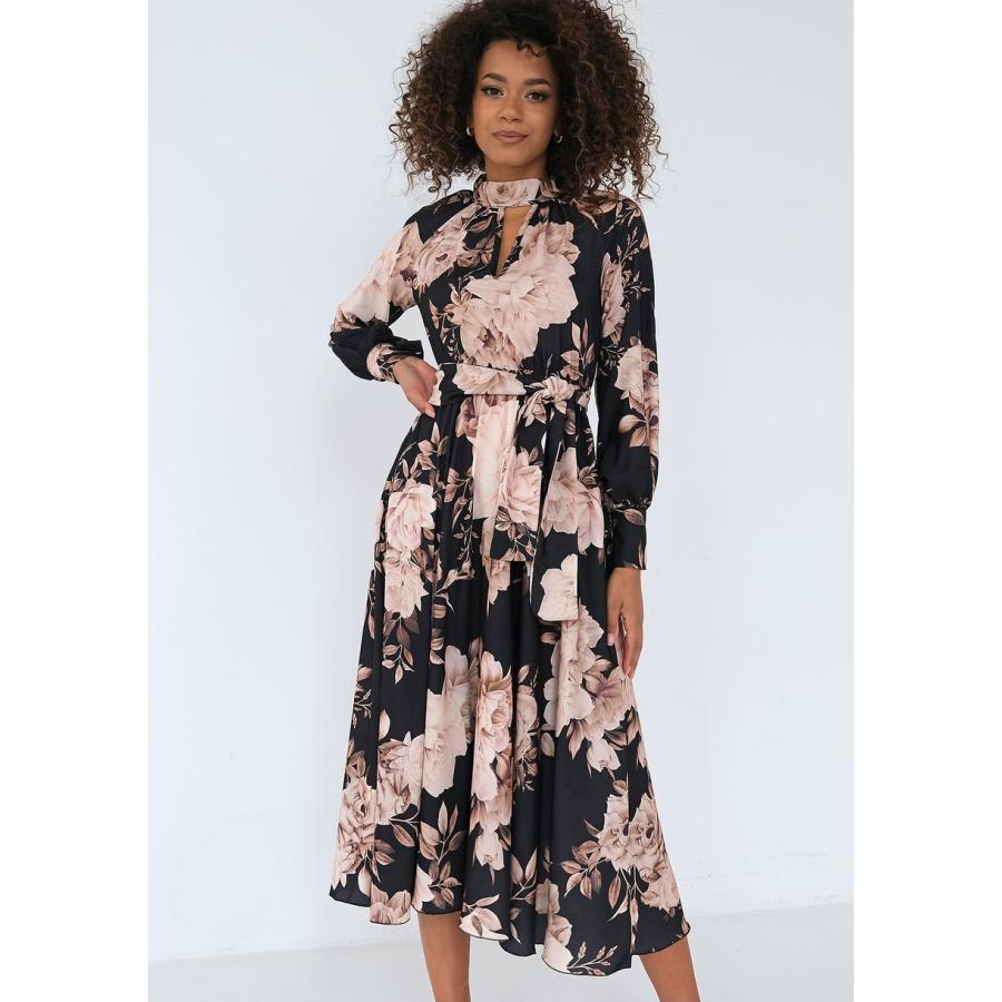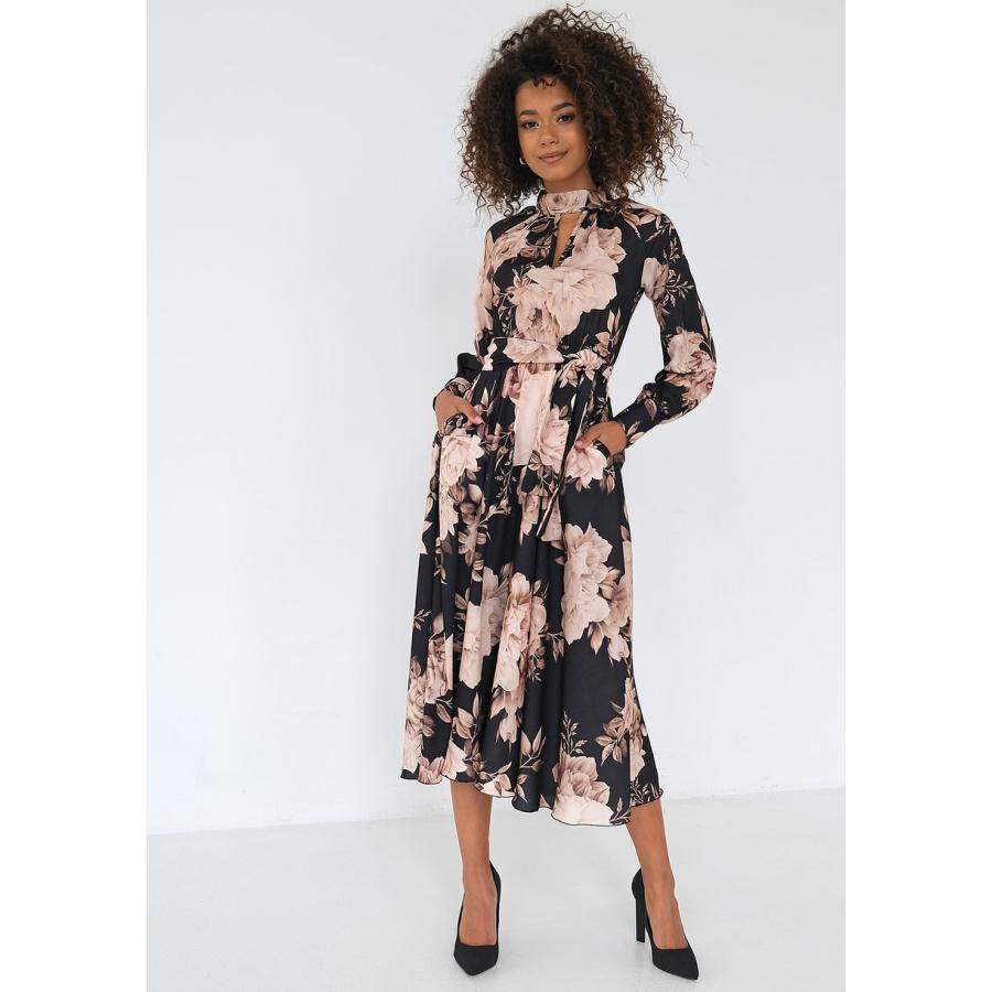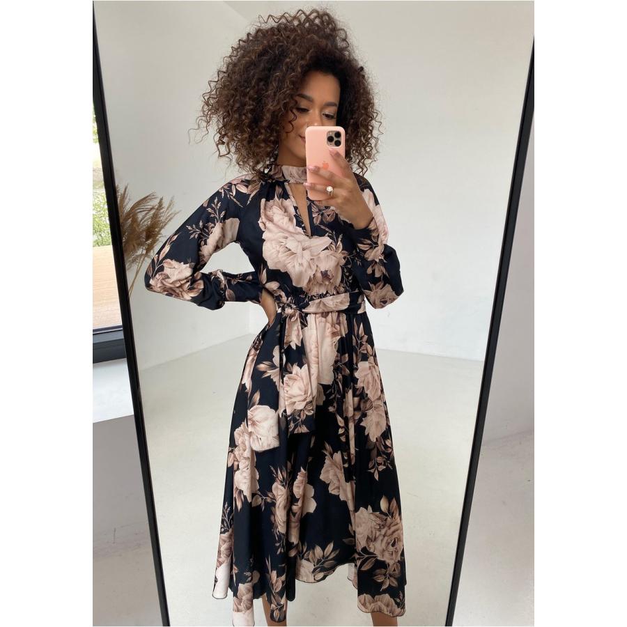 Elegantní černé midi šaty s květinami jsou krásnou kreací pro chladné období. Vaše silueta v ní bude prezentována lehce a žensky. Pohodlně se v ní budete cítit spoustu hodin v práci, při důležitých setkáních a oslavách. Model zaujme módním střihem pod límcem výstřihu.