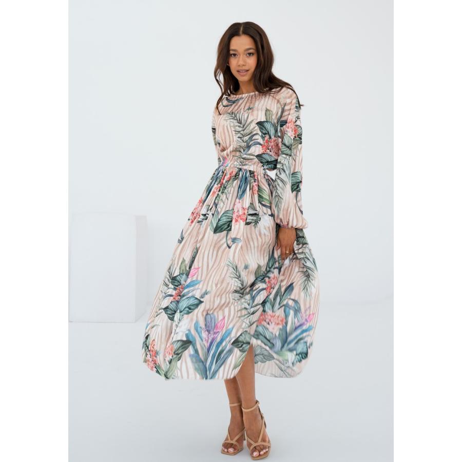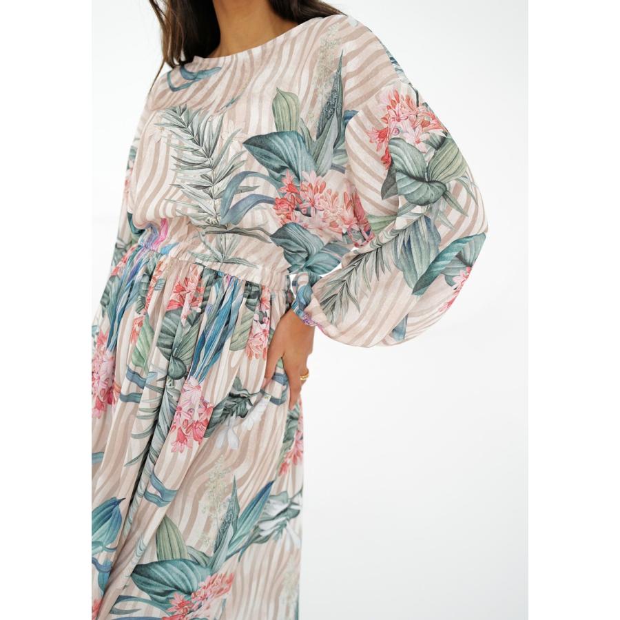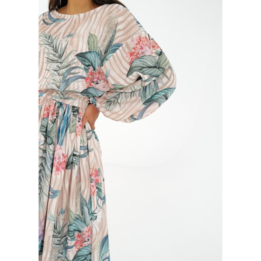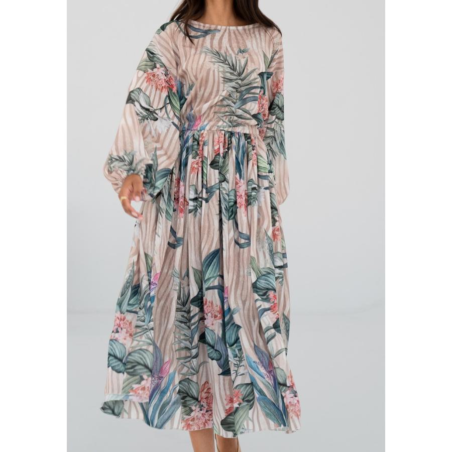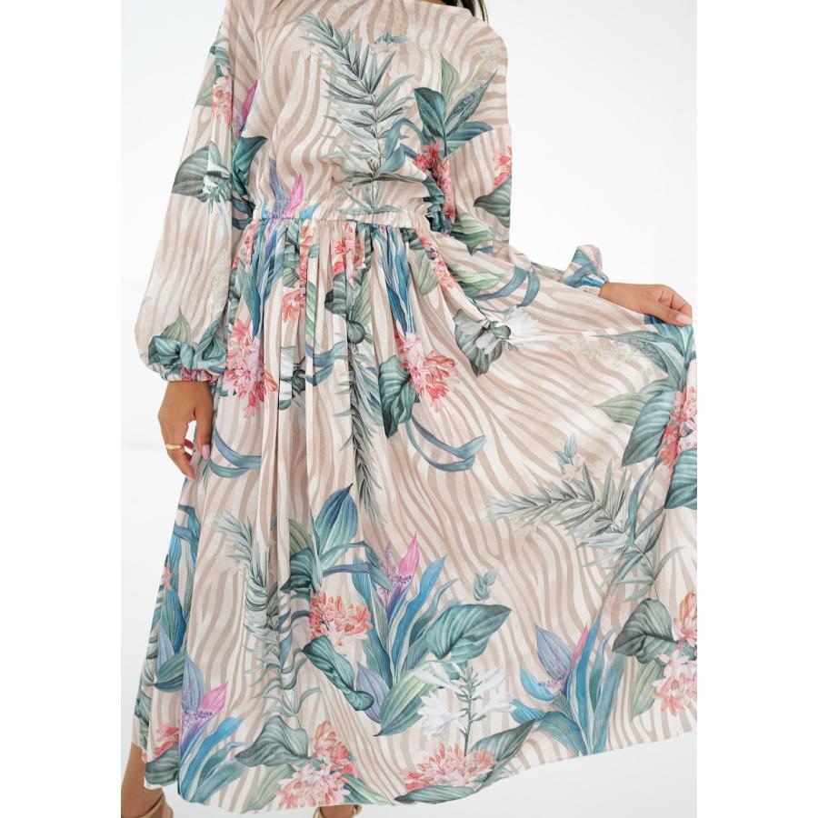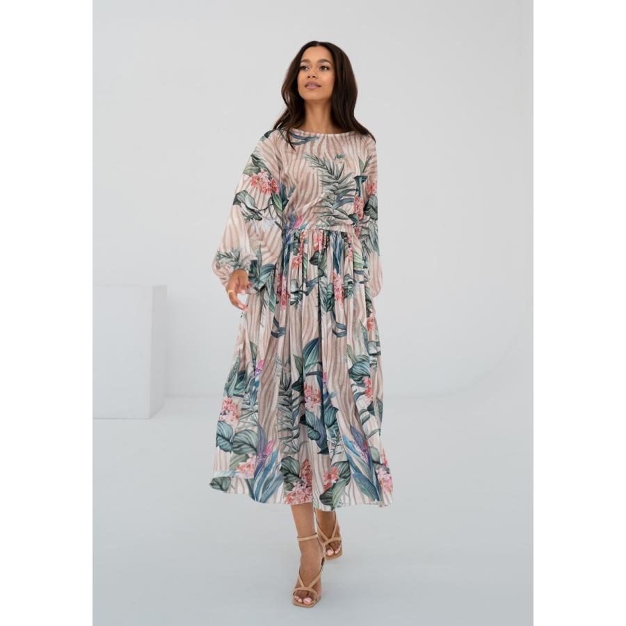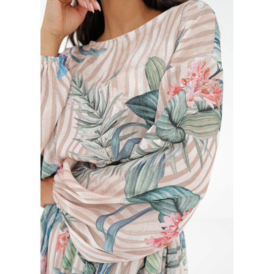 Rozšířené midi šaty s jarní kompozicí květin a proužků na elegantním šifonu. Vzdušné, jemné a velmi pohodlné.