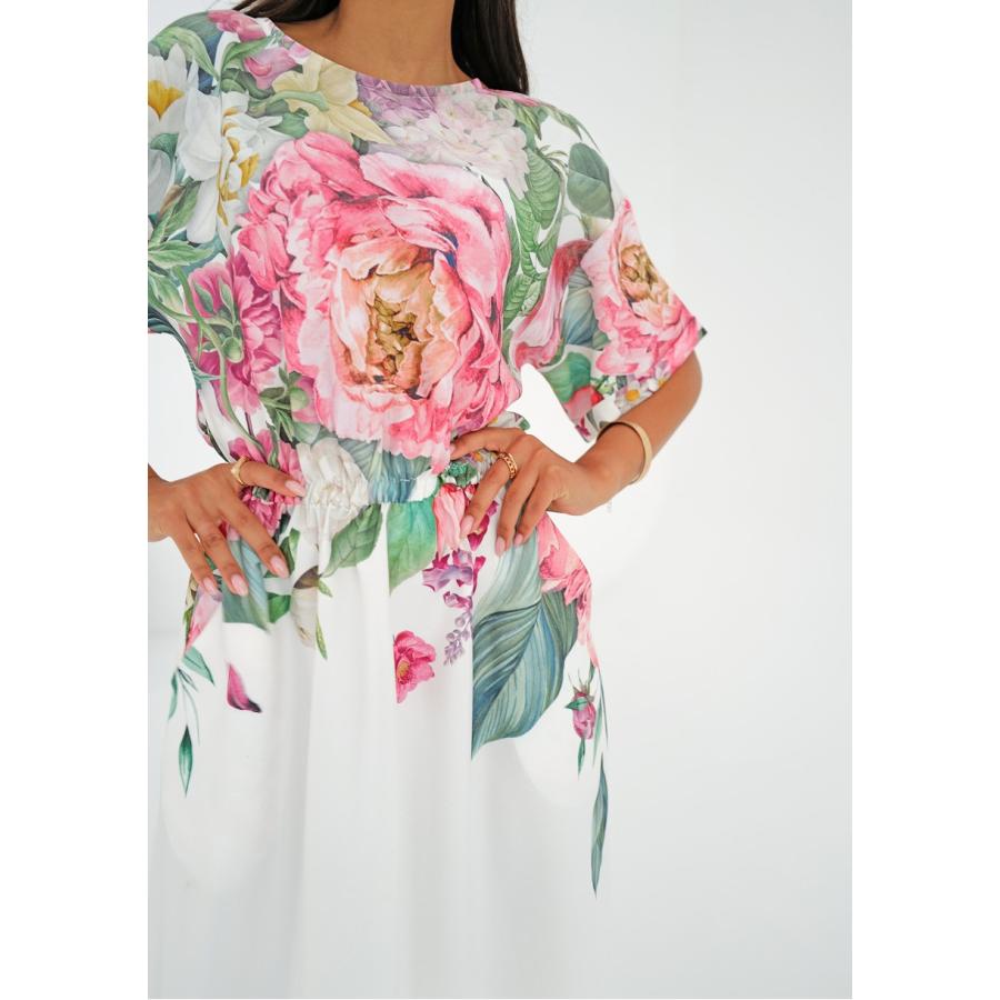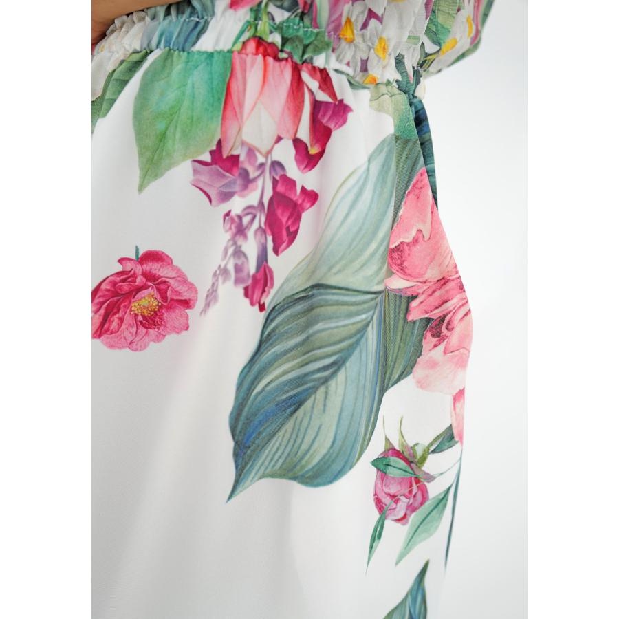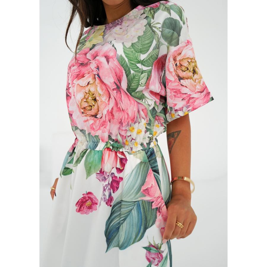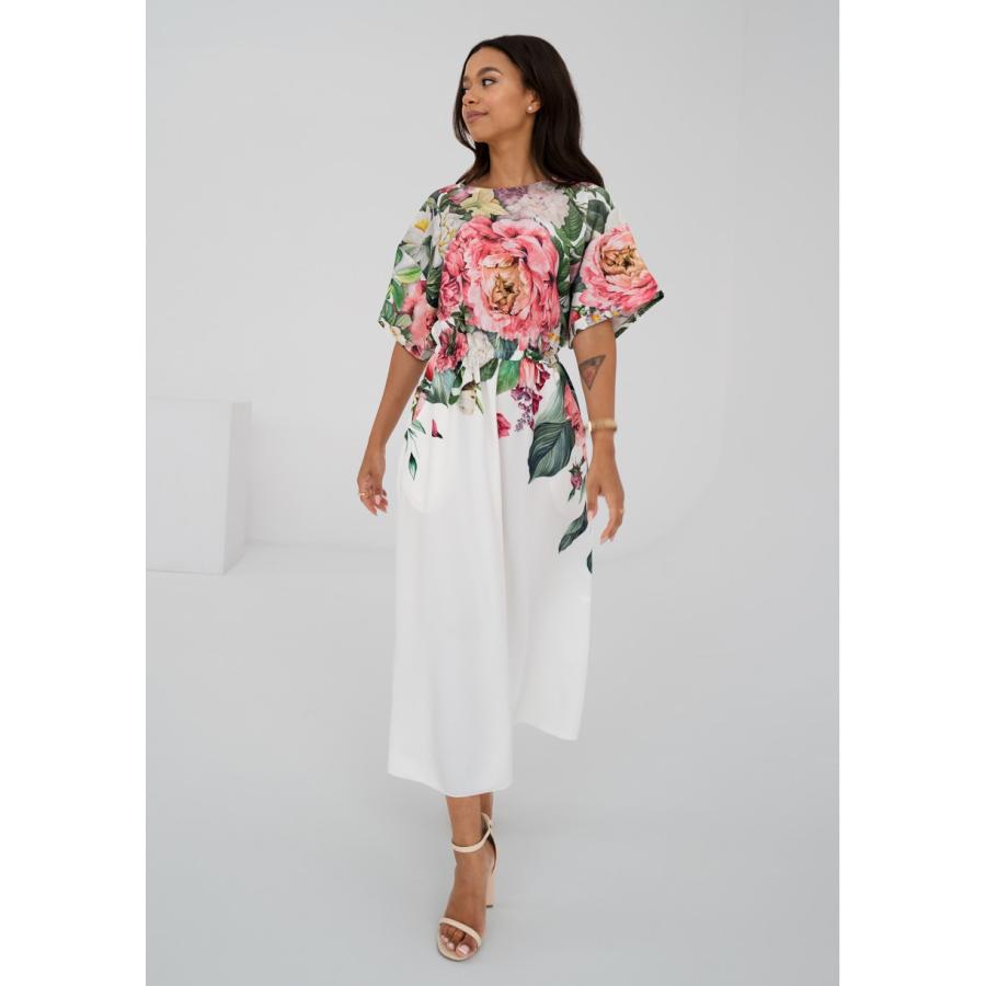 Koktejlové midi šaty v ecru odstínu s jarním vzorem květin. Vyrobeno z lehké, nemačkavé látky. Pohodlný outfit je vybaven kapsami.