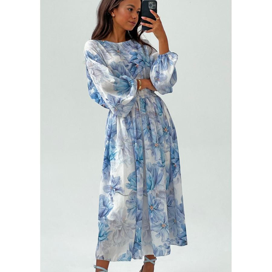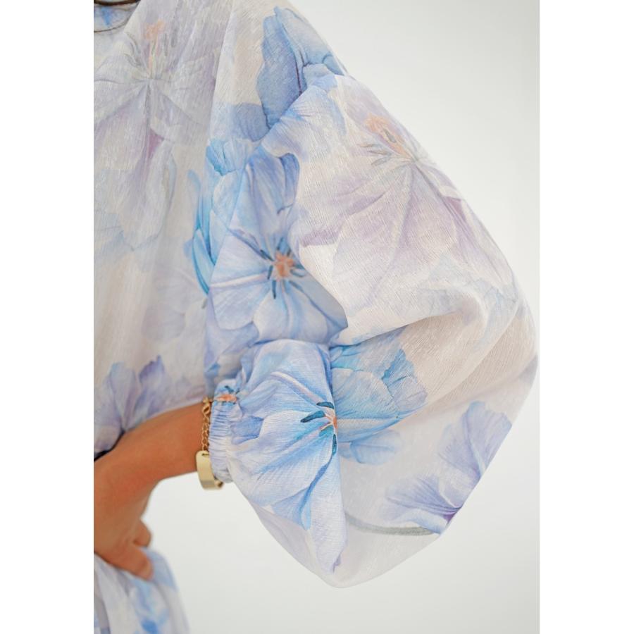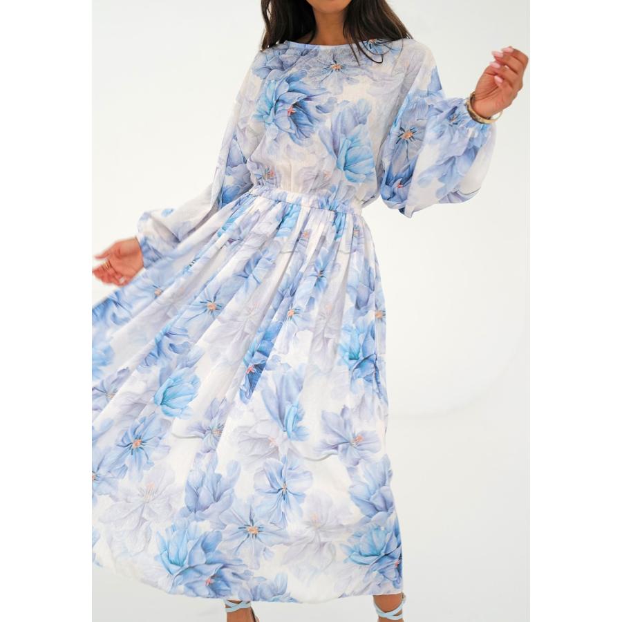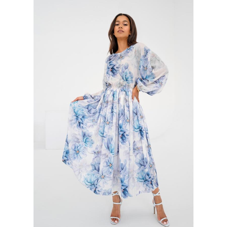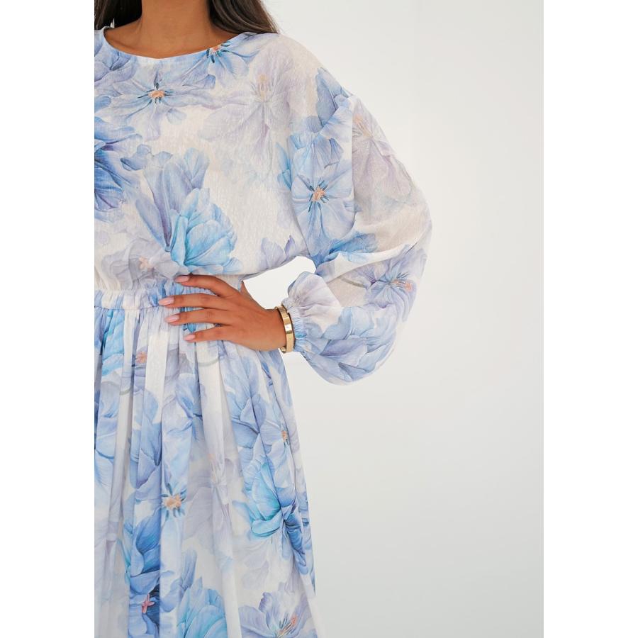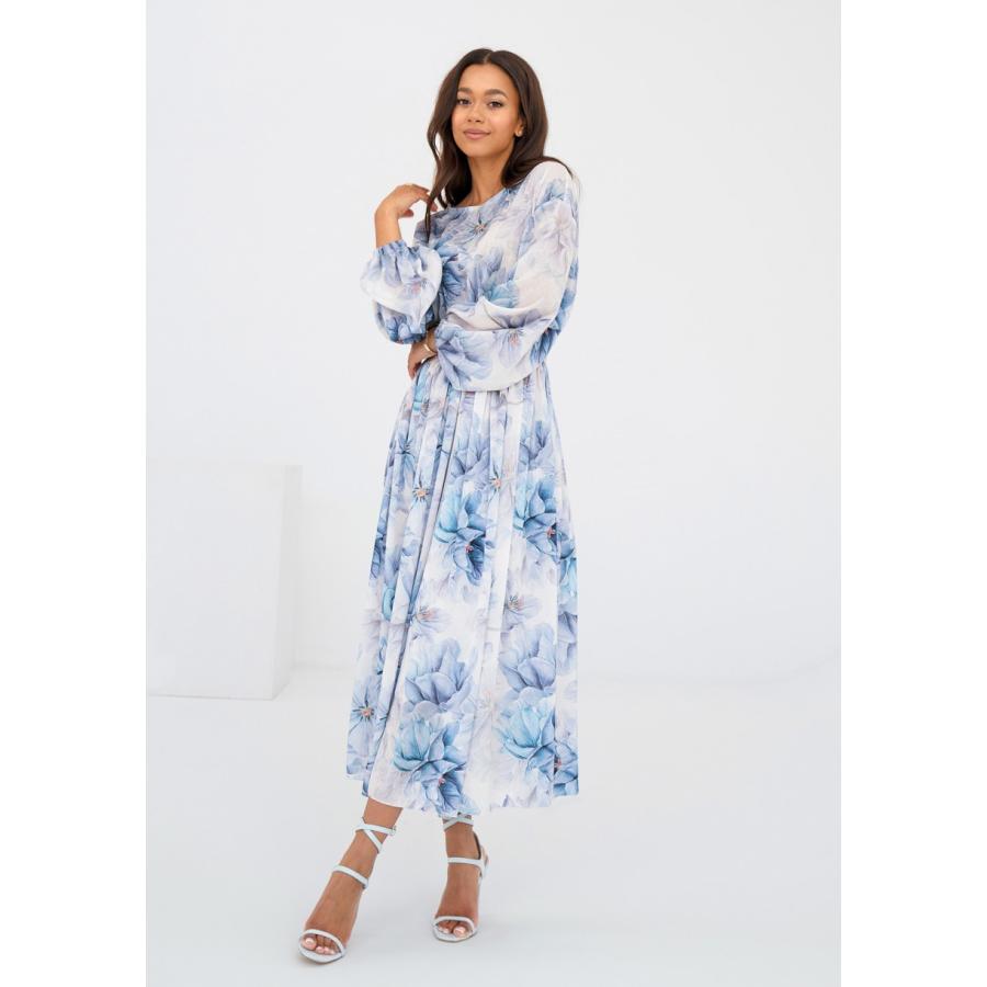 Rozšířené midi šaty s jarní kompozicí modrých květů na vzdušné látce. Model univerzálního, velmi pohodlného střihu s kapsami.