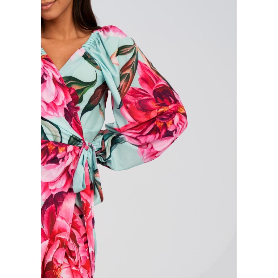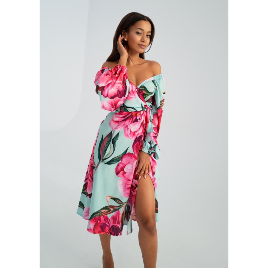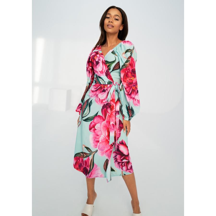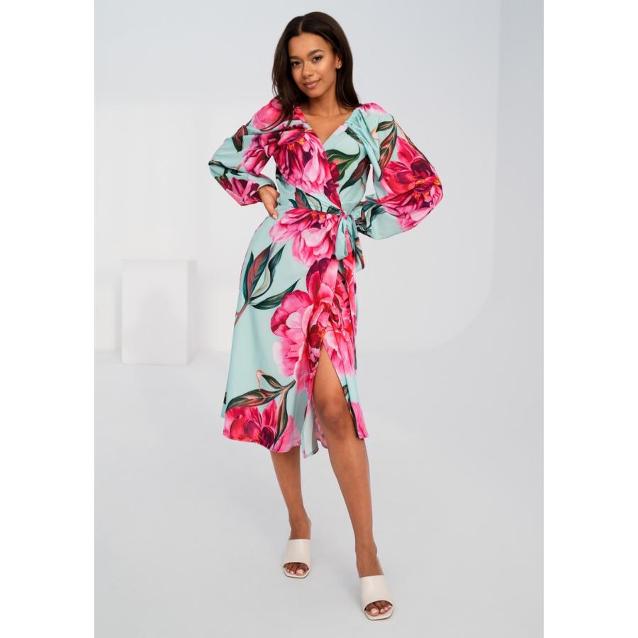 Obálkové midi šaty s krásnou kompozicí pivoněk. Tvorba s možností sesouvání rukávů.
