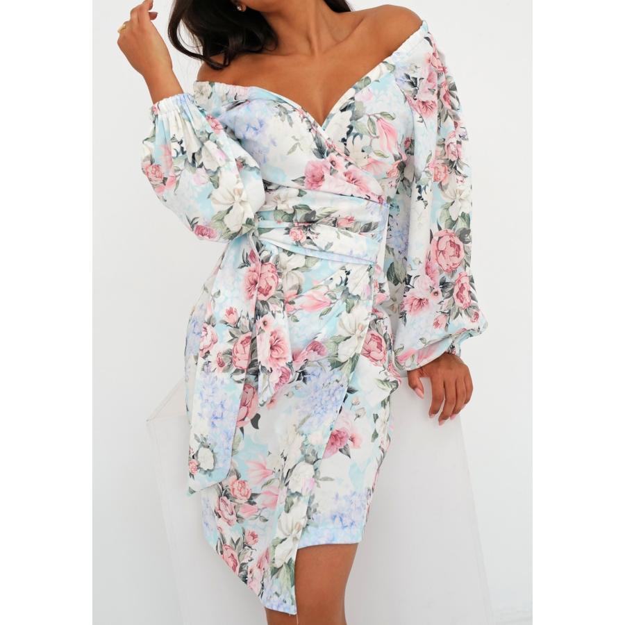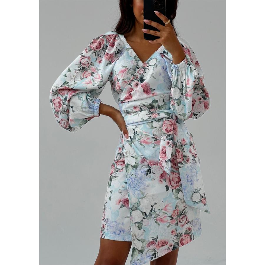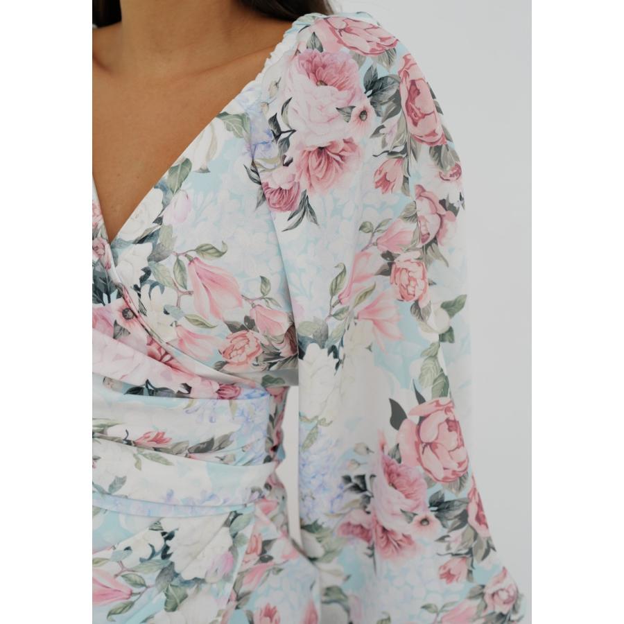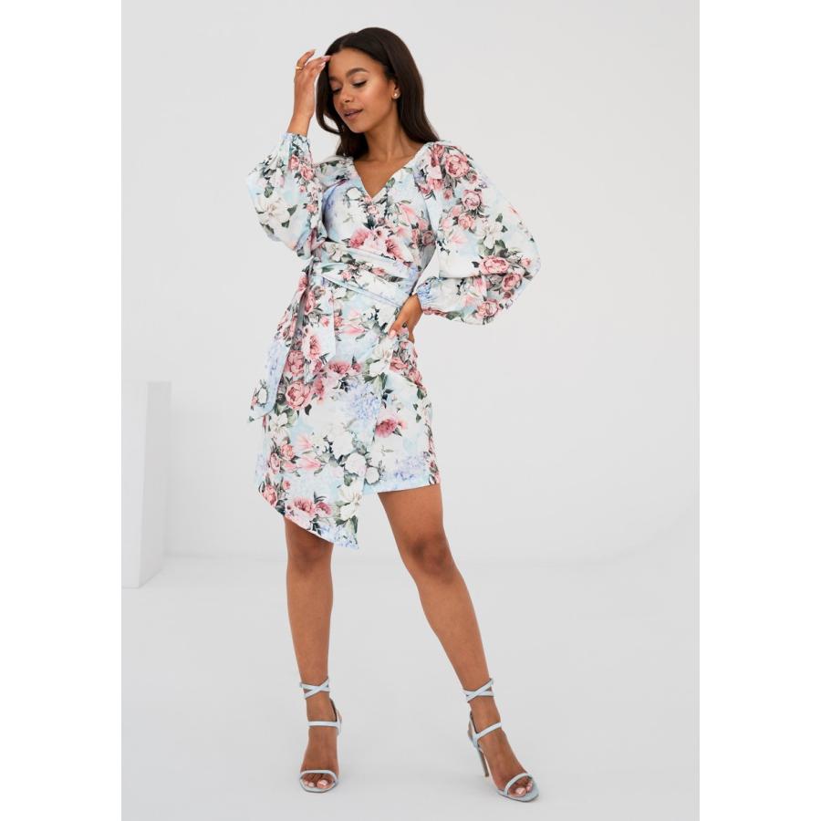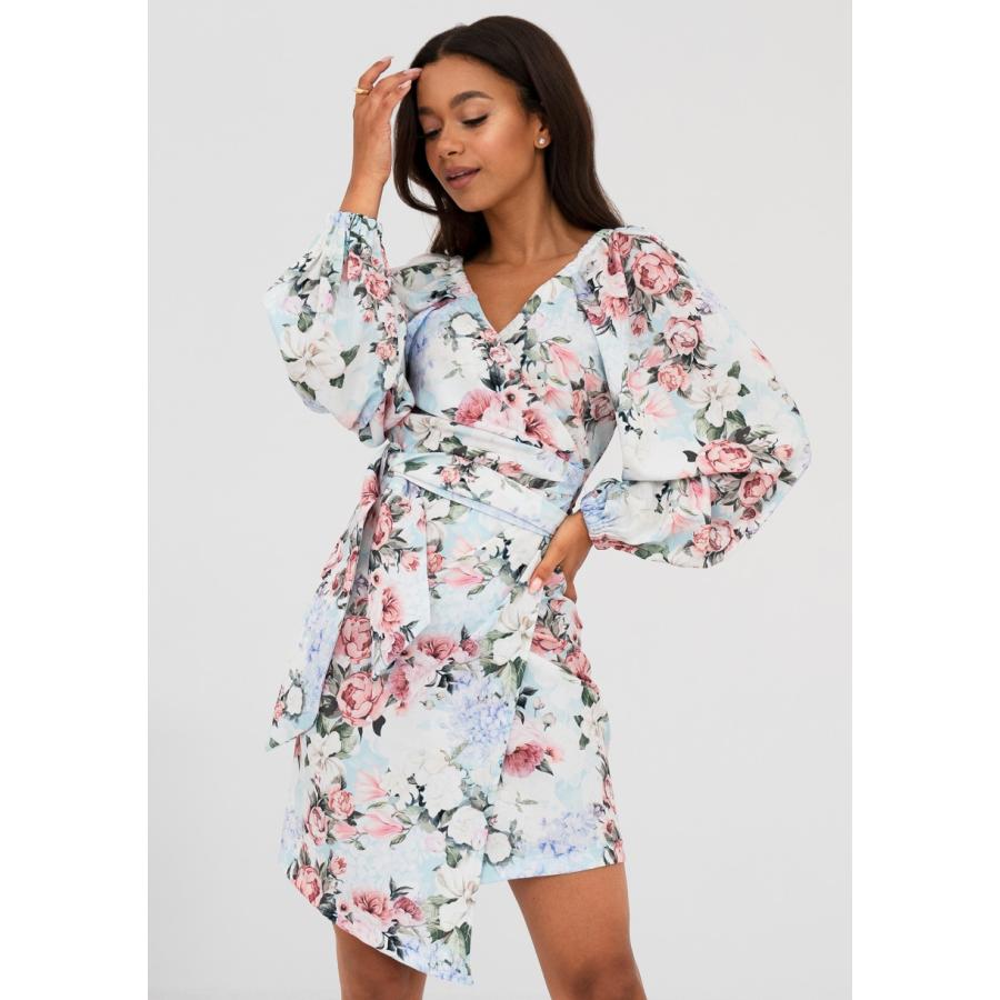 Asymetrické květinové zavinovací šaty s elegantním šněrováním a volnými rukávy. Kreace je jako stvořená pro oficiální setkání a oslavy.