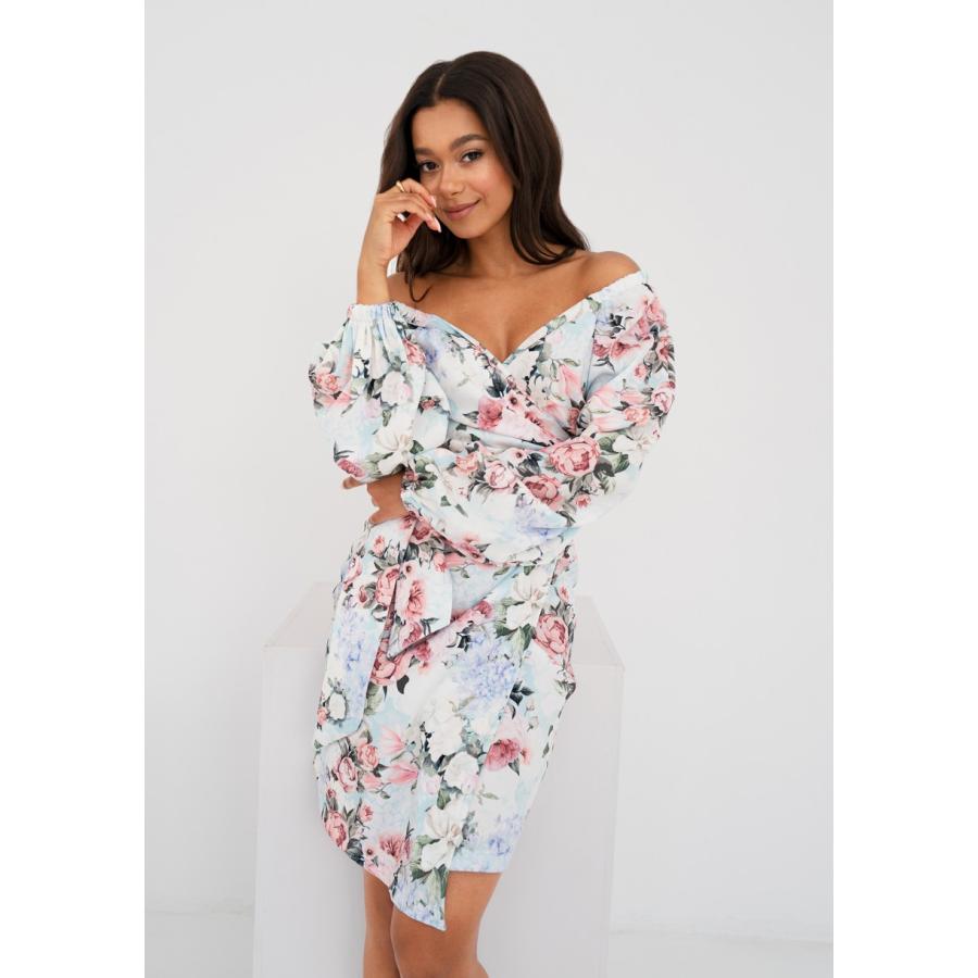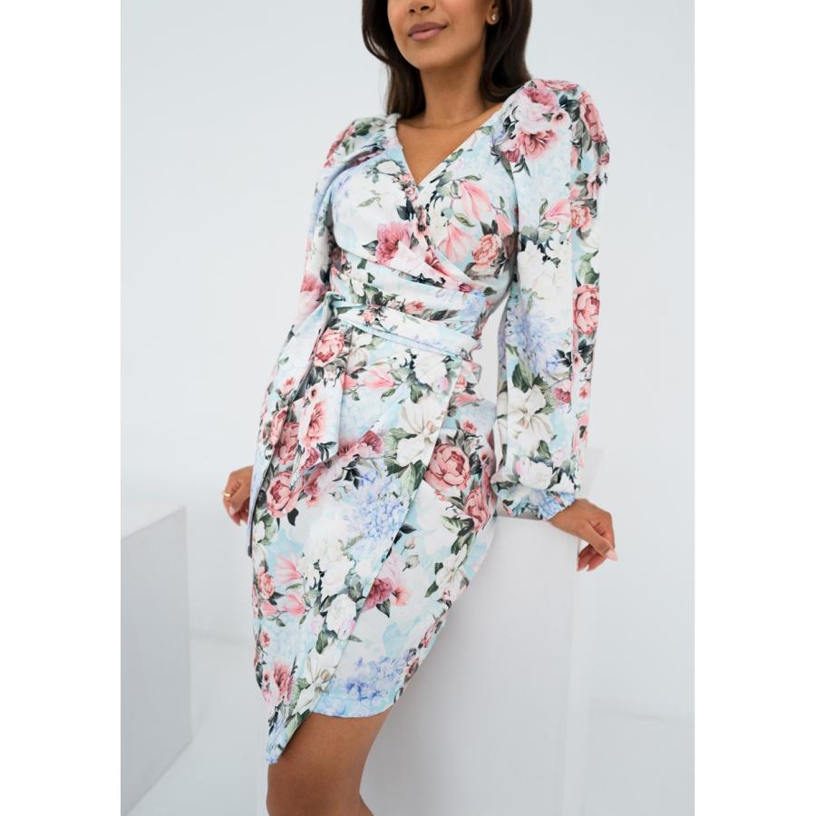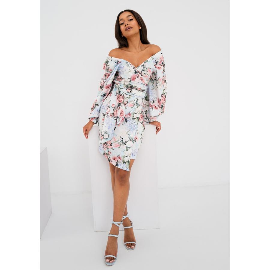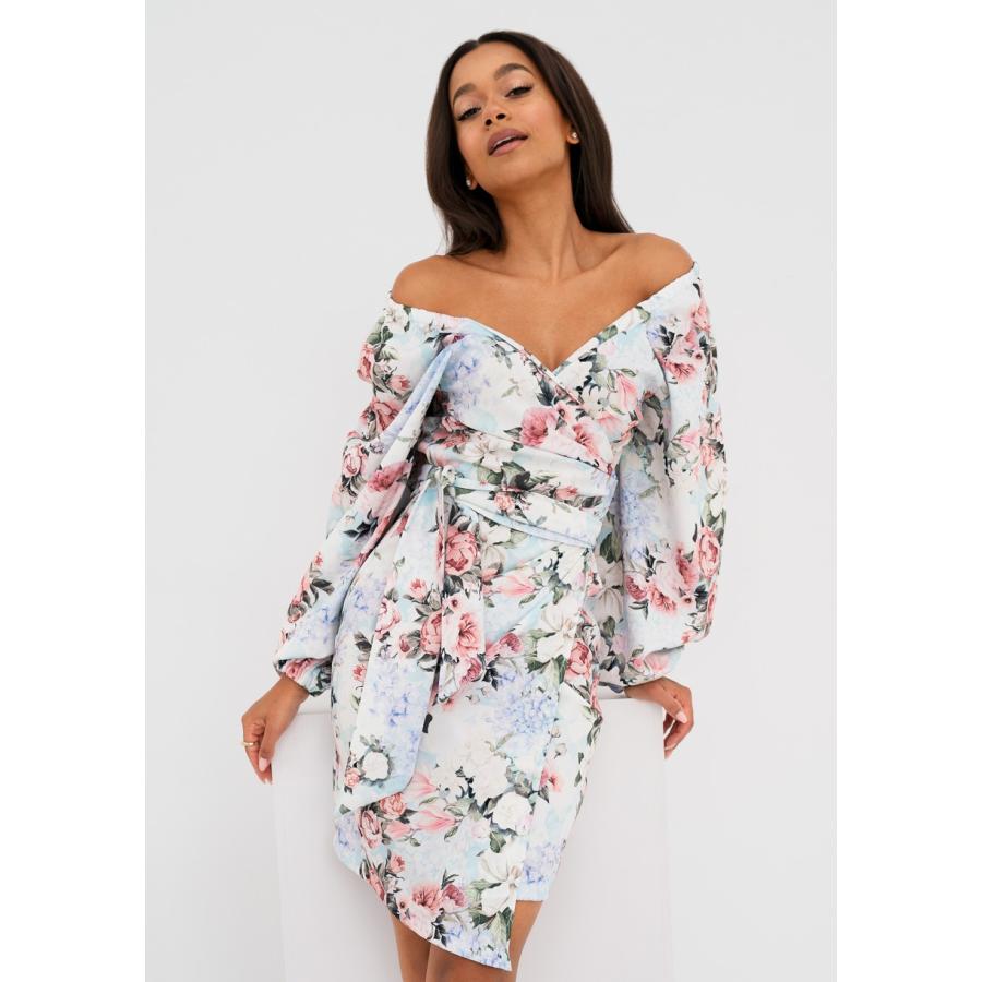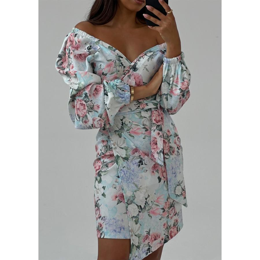 Asymetrické květinové zavinovací šaty s elegantním šněrováním a volnými rukávy. Kreace je jako stvořená pro oficiální setkání a oslavy.