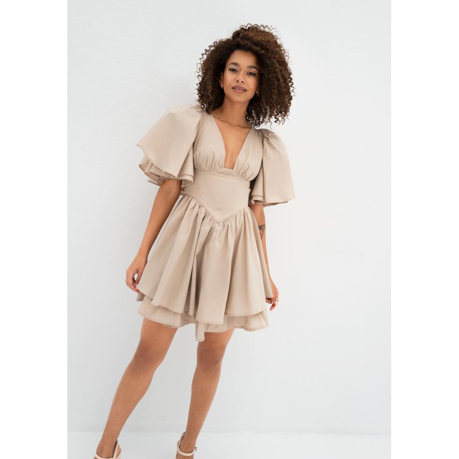 Béžové letní šaty s jedinečným střihem. Krásně složeno s volány, korzetovou vložkou a rozšířeným spodním dílem. Ideální pro slunečné dny.