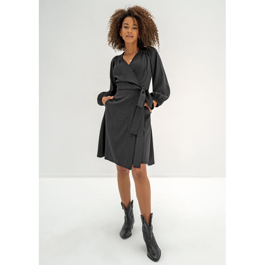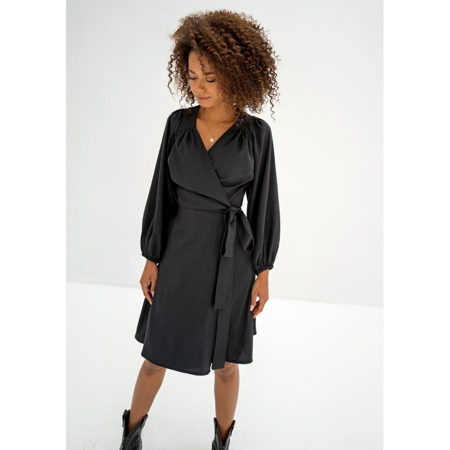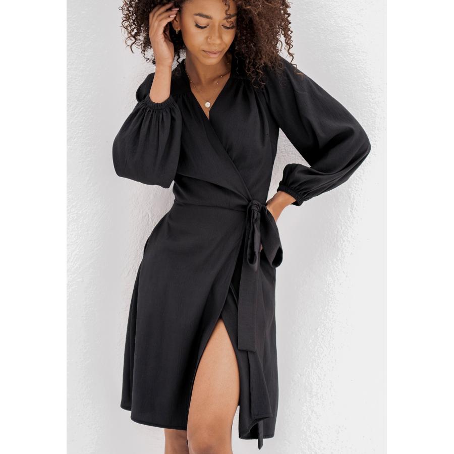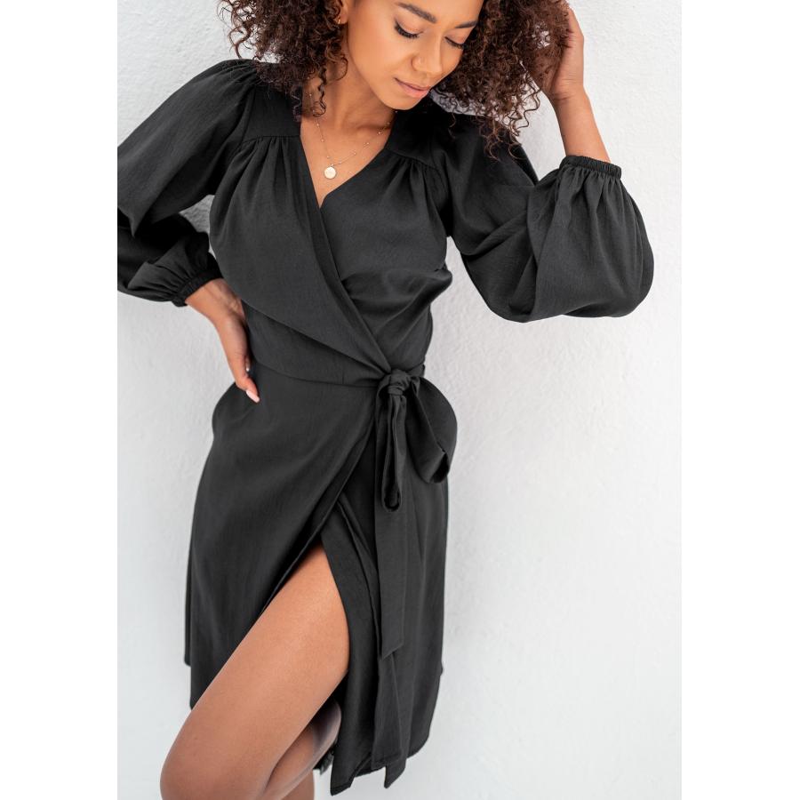 Černé obálkové šaty MOSQUITO s dlouhým rukávem, vyrobené z vysoce kvalitního materiálu a navržené podle nejnovějších módních trendů.