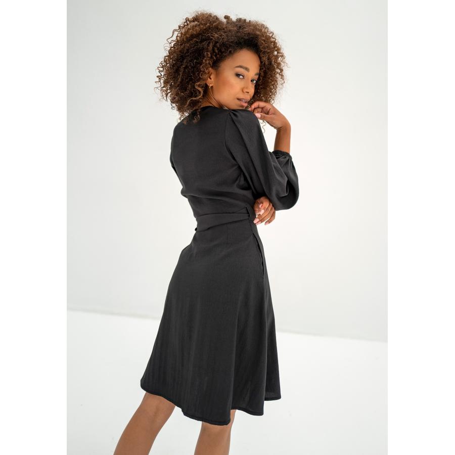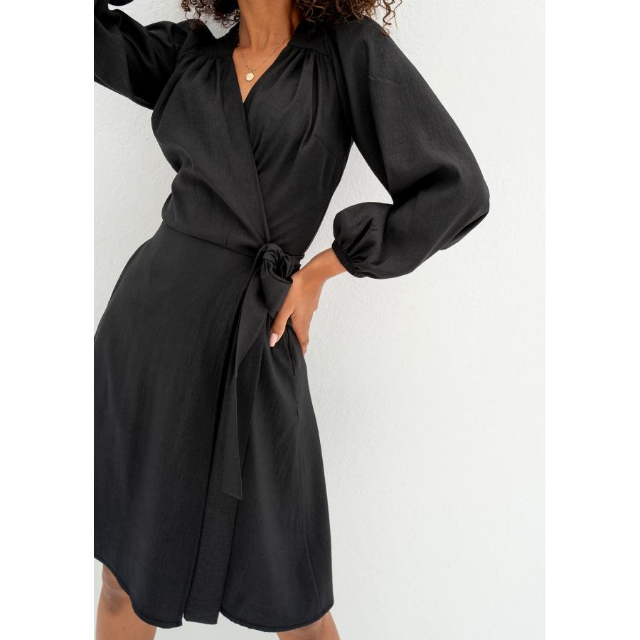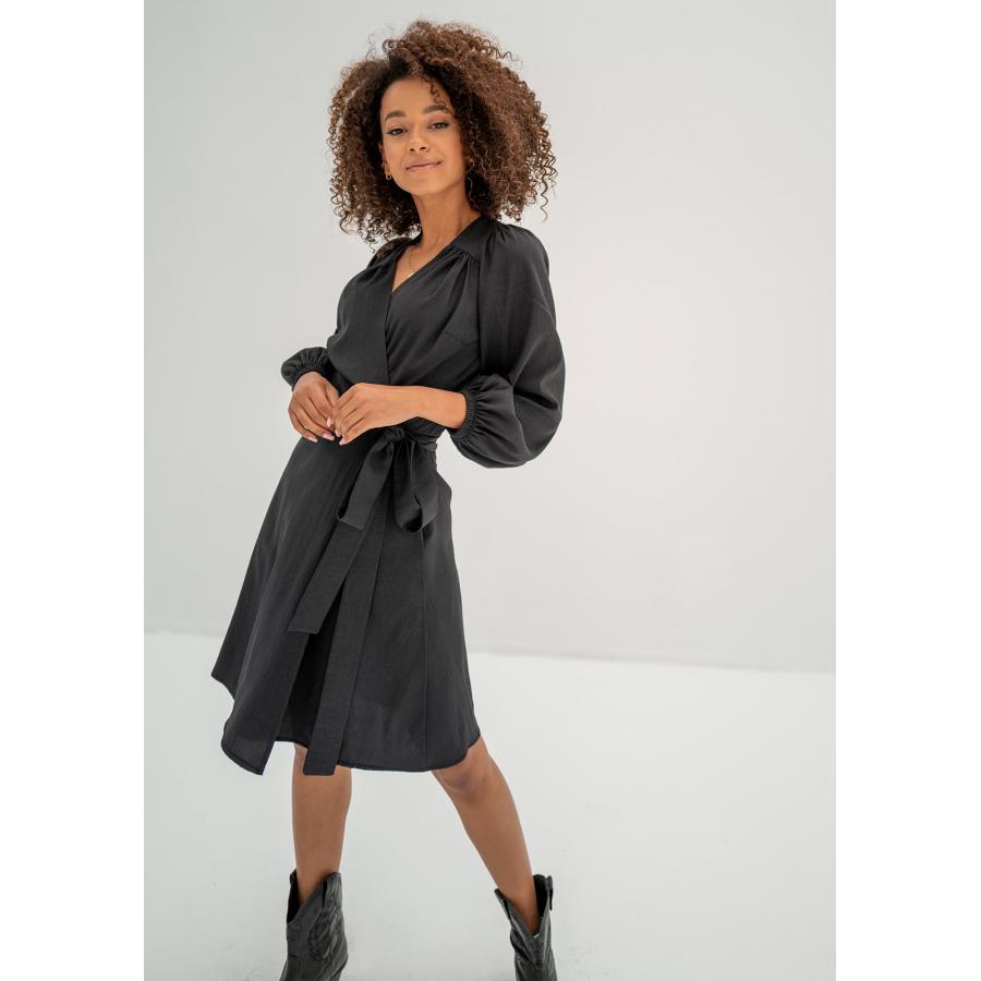 Černé obálkové šaty ze vzdušné látky. Pohodlný a univerzální model s vázáním, má kapsy.