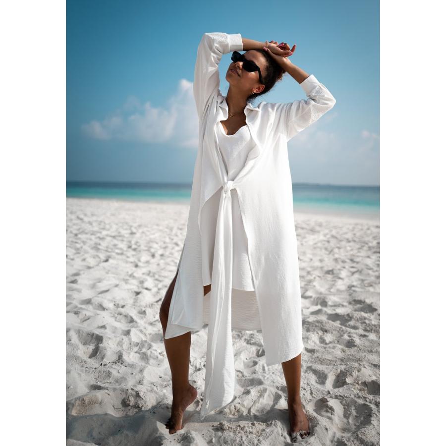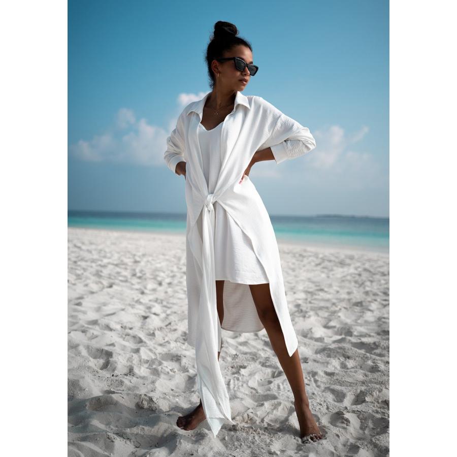 Klasické bílé ecru košilové šaty. Jedná se o unikátní, dvouvrstvý design sestávající z krátké spodničky a návleku s límcem uvázaným na různé způsoby. Jsou to pohodlné šaty pro každodenní vycházky i na pláž.