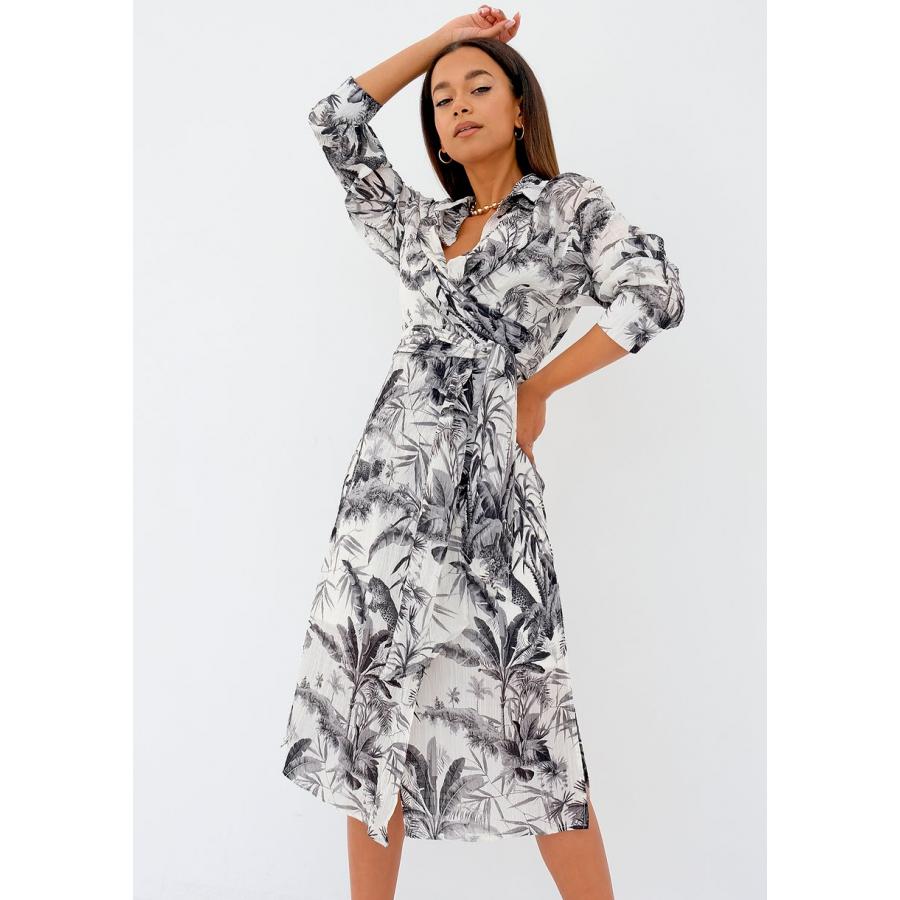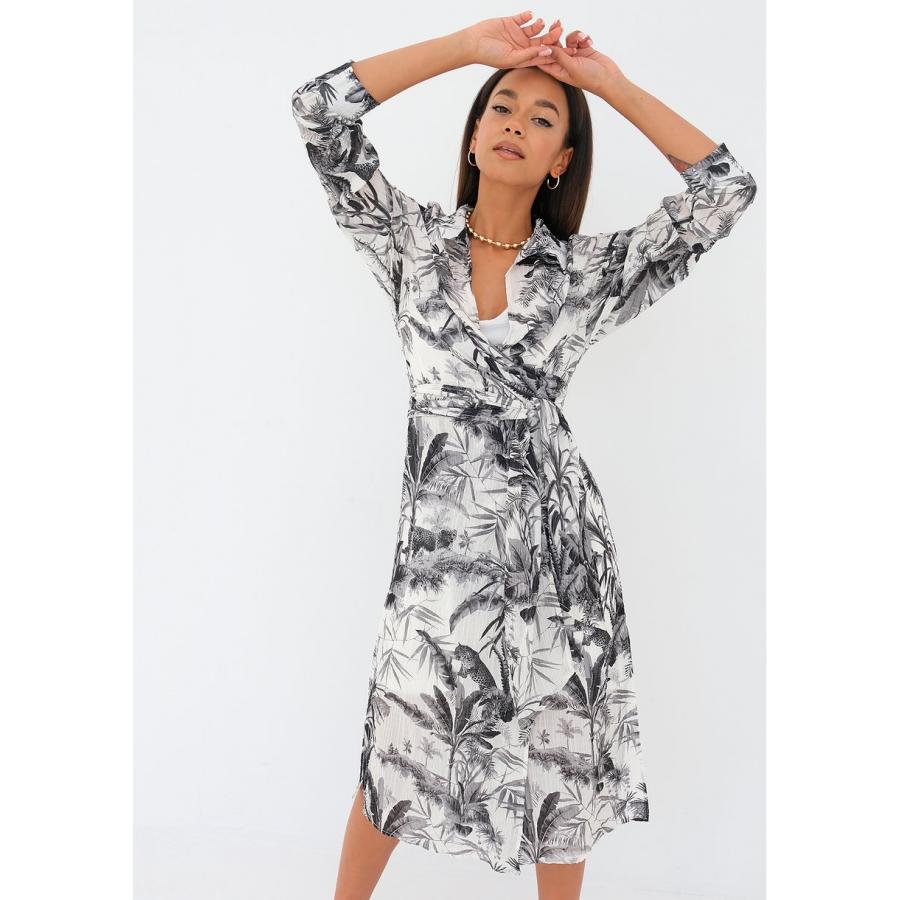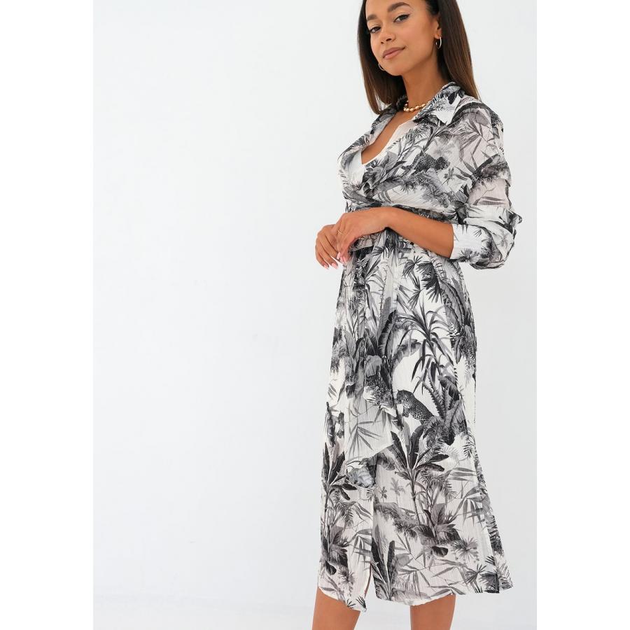Vzdušné košilové šaty s dlouhým vázáním v pase. Model se skládá z bílé mini samostatné spodničky a vzorovaných midi vrchních šatů. Zdobené černým vzorem palem, dokonale lehké na léto.Model je 163 cm vysoký, 84/62/89. Má na sobě XS.