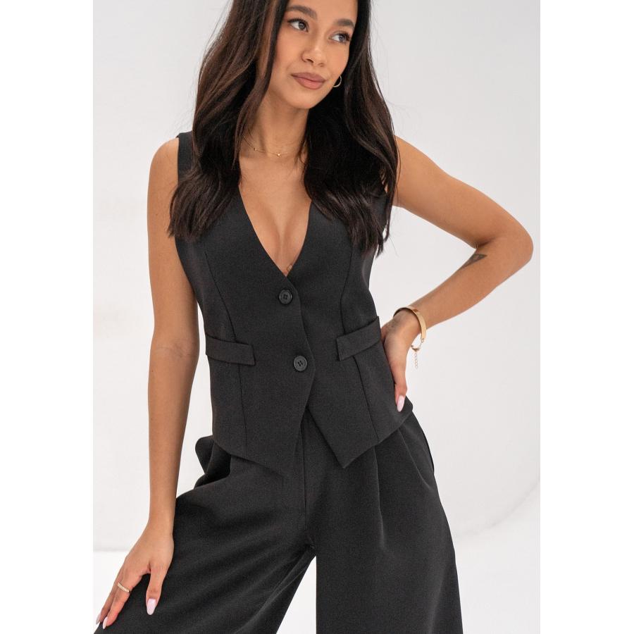 Dámská vesta na dva knoflíky. Dokonale se přizpůsobí postavě, dodá eleganci. Malá kravata vzadu zdůrazňuje rafinovaný design.
