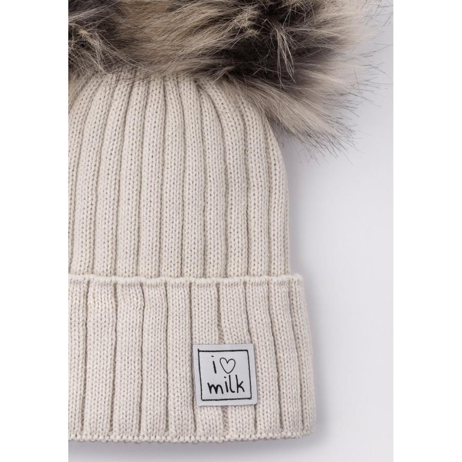 Béžová zimní čepice I LOVE MILK s bambulkami, vyrobena z vysoce kvalitního materiálu a navržena podle nejnovějších módních trendů.