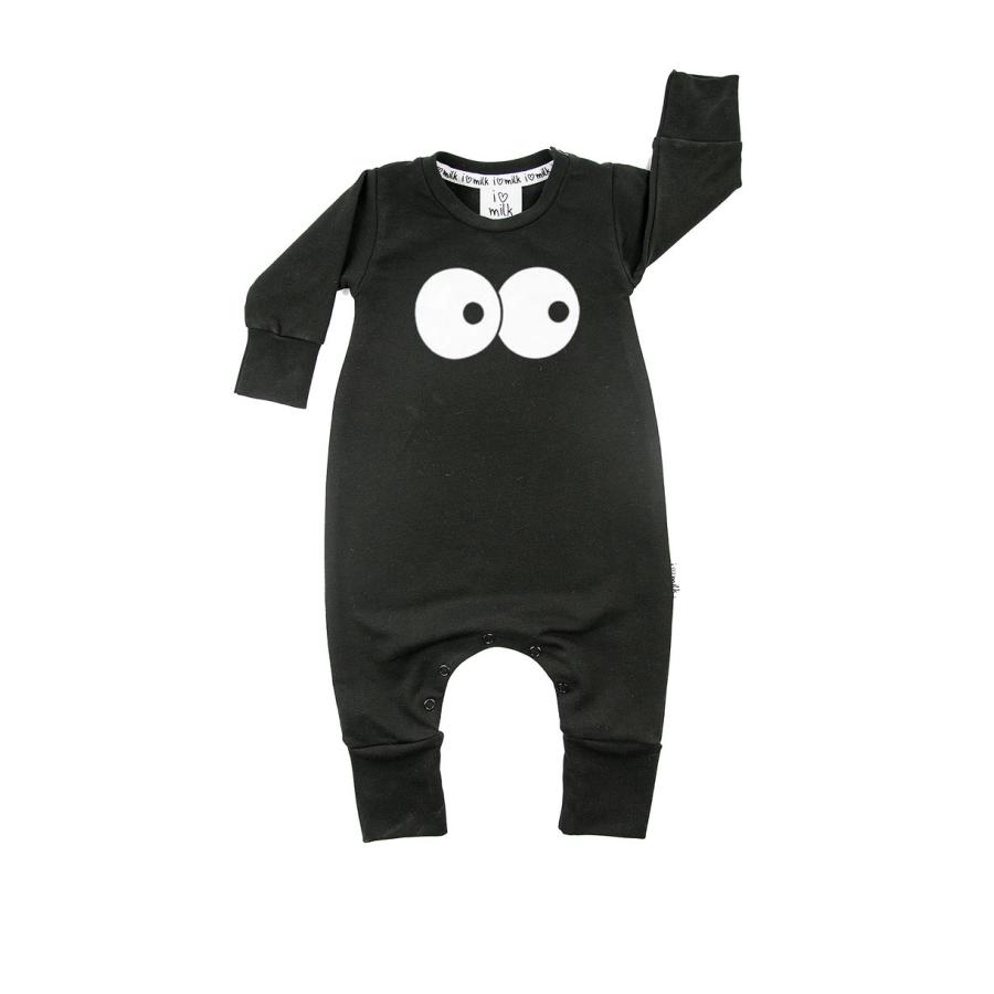 Černý I LOVE MILK overal s potiskem očí, vyrobený z vysoce kvalitního materiálu a navržený podle nejnovějších módních trendů.