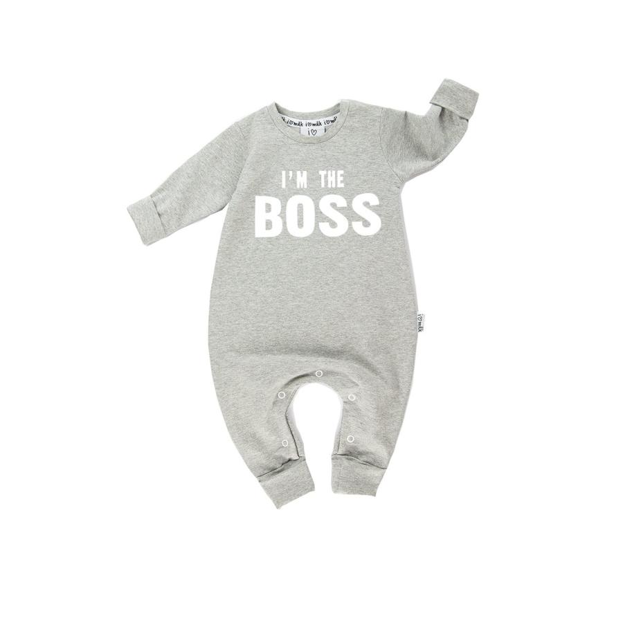 Šedý overal I LOVE MILK s nápisem "i'm the boss", vyrobený z vysoce kvalitního materiálu a navržený podle nejnovějších módních trendů.