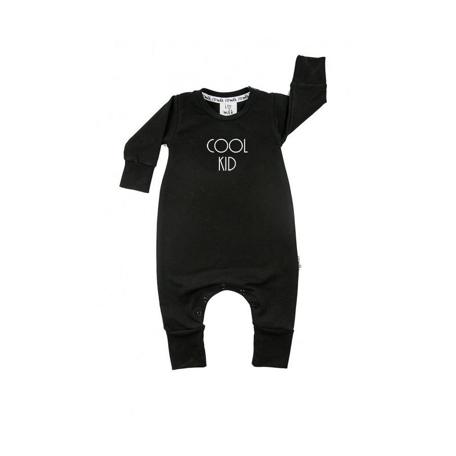 Černý overal I LOVE MILK s nápisem "cool kid", vyrobený z vysoce kvalitního materiálu a navržený podle nejnovějších módních trendů.