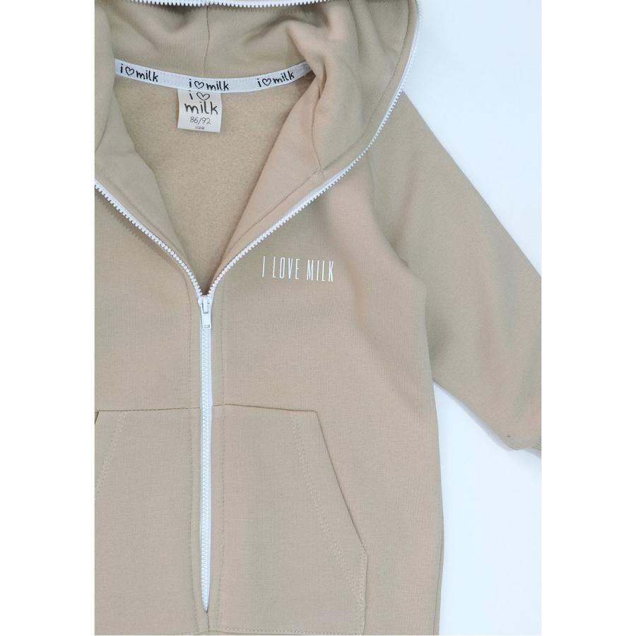 Kojenecký béžový I LOVE MILK overal s kapucí, vyrobený z vysoce kvalitního materiálu a navržený podle nejnovějších módních trendů.
