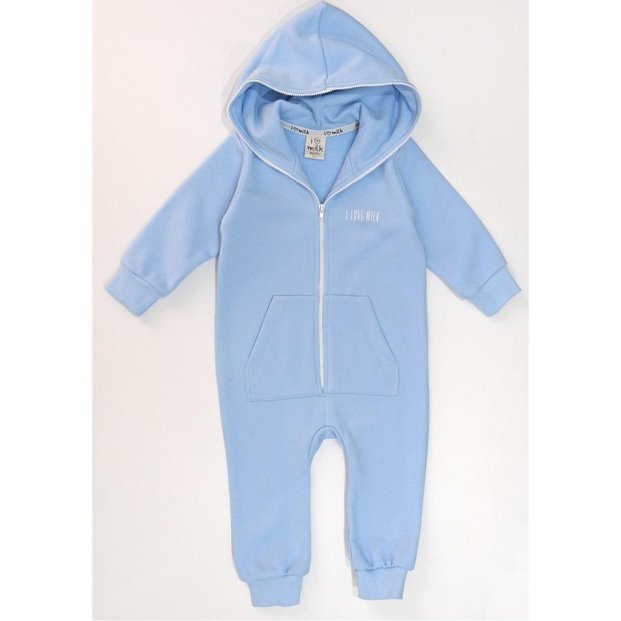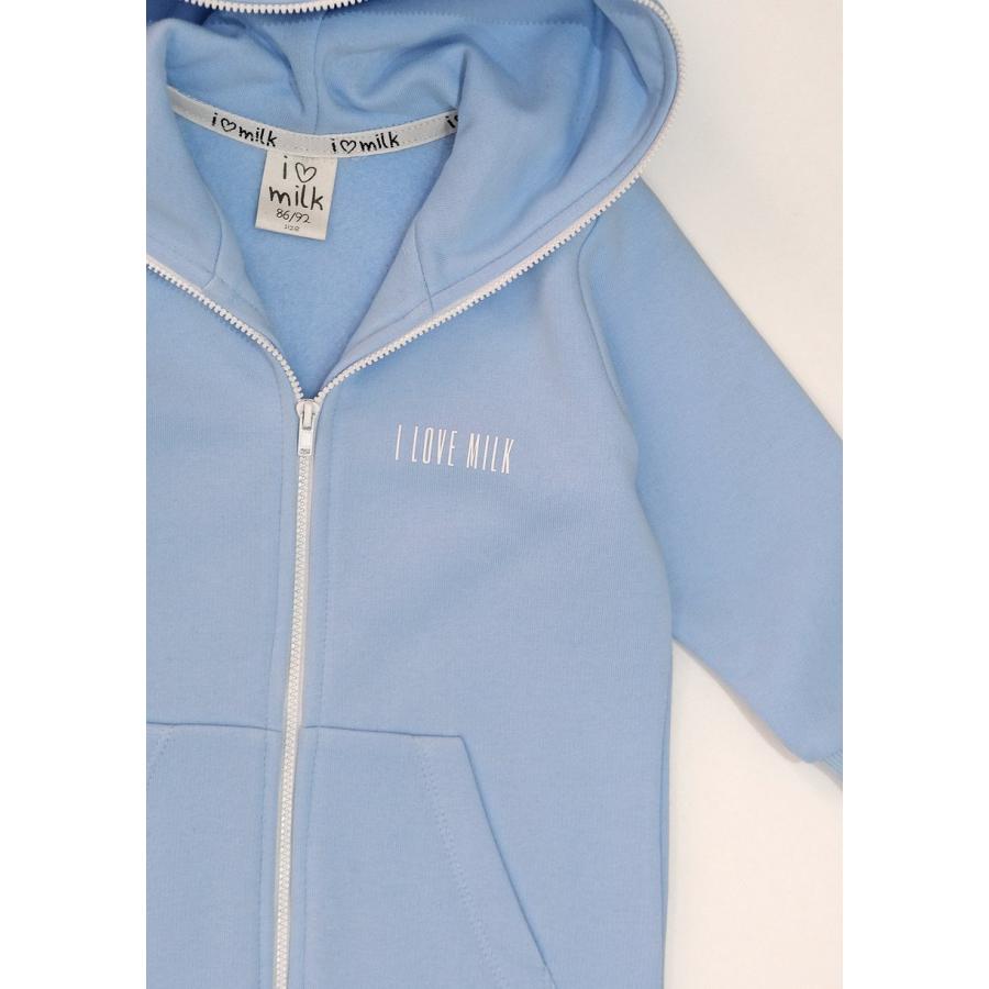Kojenecký modrý I LOVE MILK overal s kapucí, vyrobený z vysoce kvalitního materiálu a navržený podle nejnovějších módních trendů.