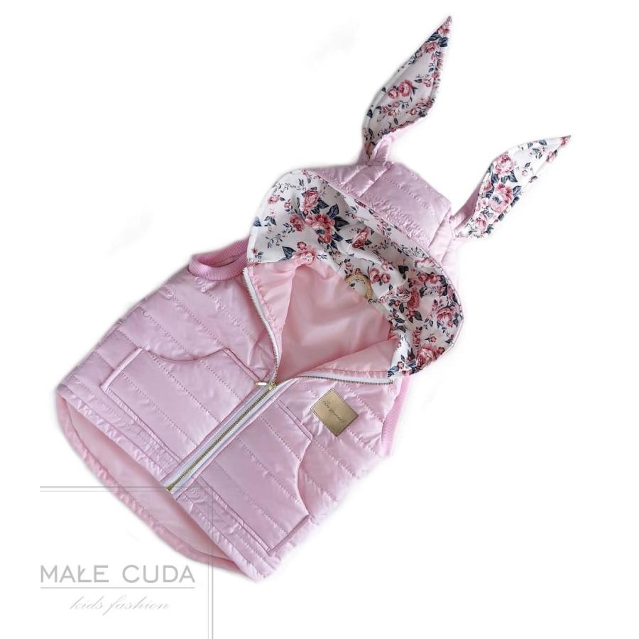 Prošívaná vesta růžové barvy s potiskem růží, vyrobená z vysoko kvalitného materiálu a navrhnutá podľa najnovších módnych trendov.