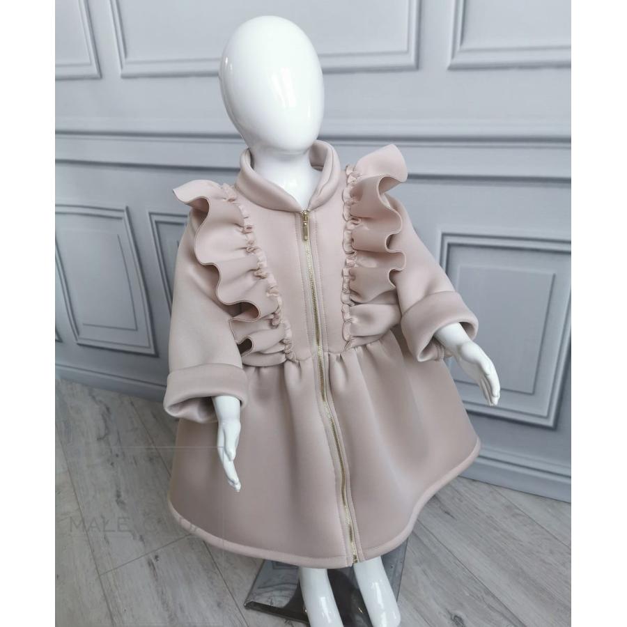 Béžový elegantní kabát s volány, vyrobený z vysoce kvalitního materiálu a navržený podle nejnovějších módních trendů.