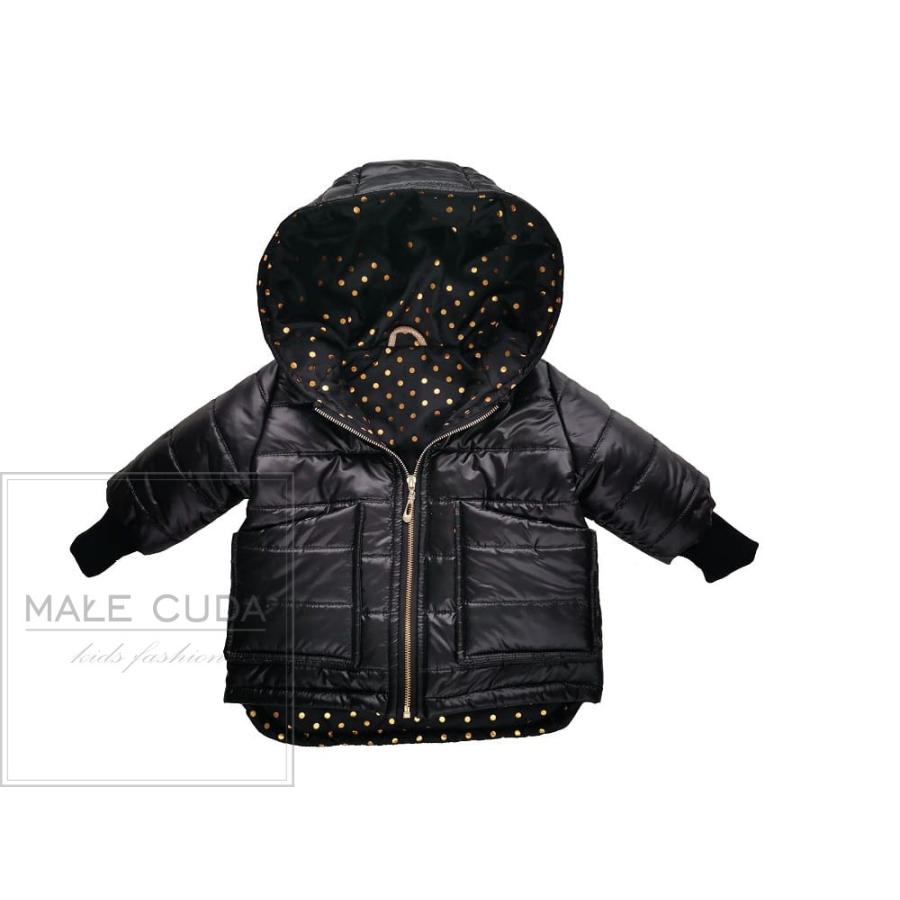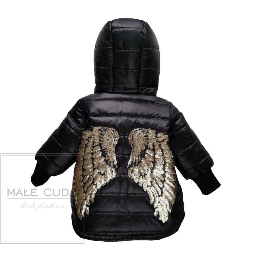 Černá dívčí bundička se zlatými křídly, vyrobená z vysoko kvalitného materiálu a navrhnutá podľa najnovších módnych trendov.