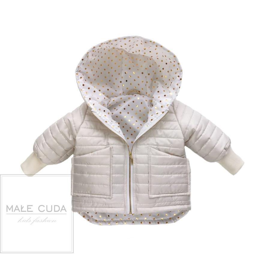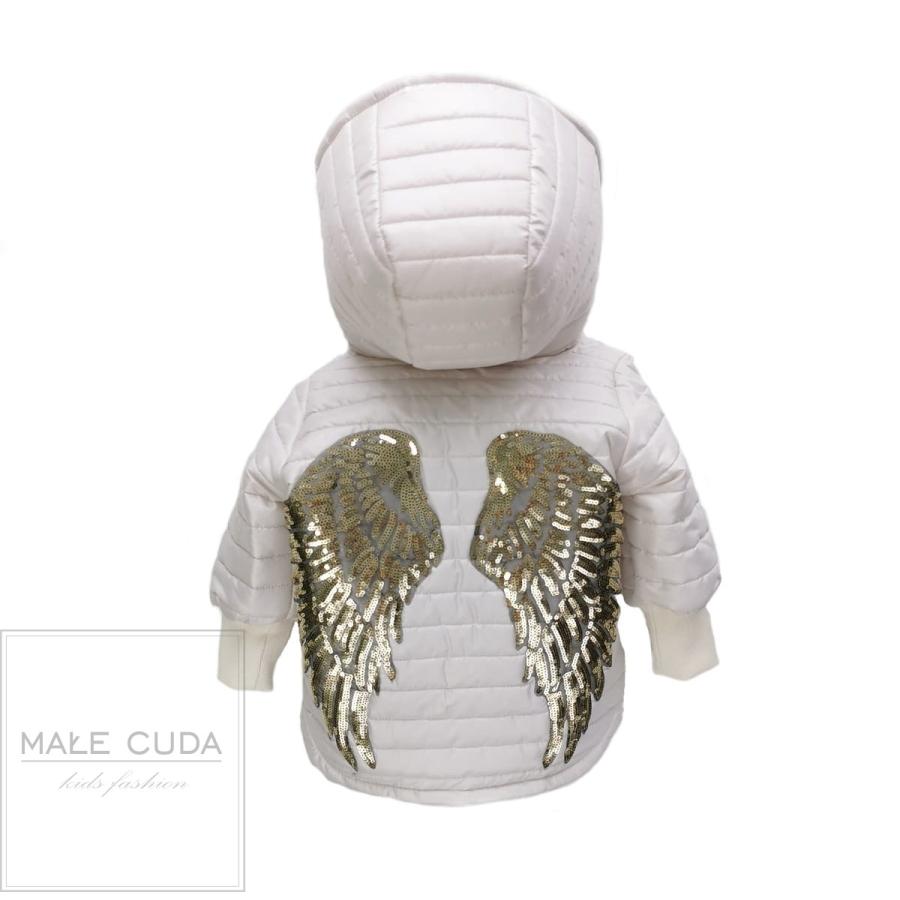 Bílá dívčí bundička se zlatými křídly, vyrobená z vysoko kvalitného materiálu a navrhnutá podľa najnovších módnych trendov.